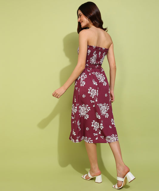 Women's Maroon Floral Strapless Smocked Midi Dress β Casual Summer Outfit
