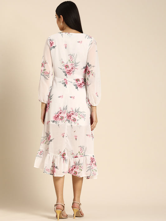 Chic White Floral Midi Dress with Puffy Sleeves & Ruffle Hem Elegant Summer Look