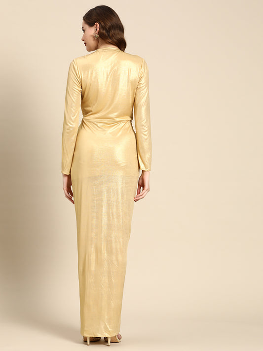 Elegant Gold Metallic Long Sleeve Twist Front Dress | Sophisticated Evening Gown