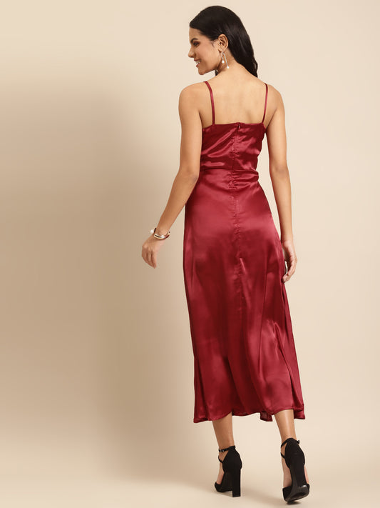 Wine Red Satin Wrap Dress for Women | Spaghetti Strap Midi Dress for Parties