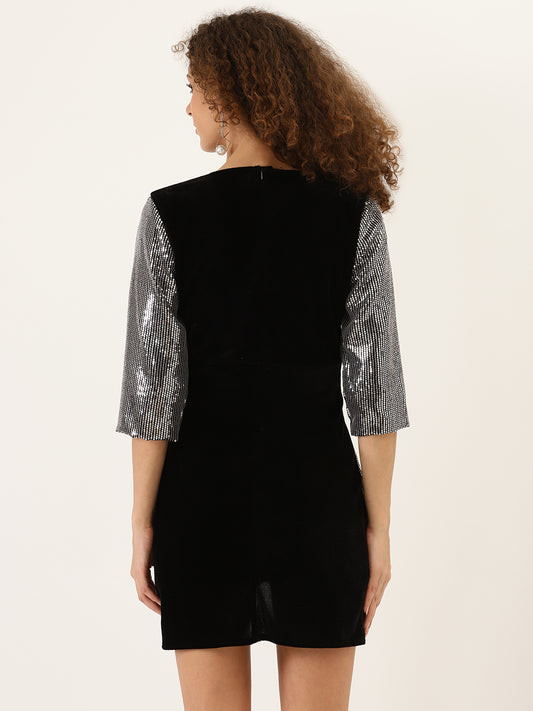 Black Sequin V-Neck Mini Dress with Long Sleeves – Glam Party Wear