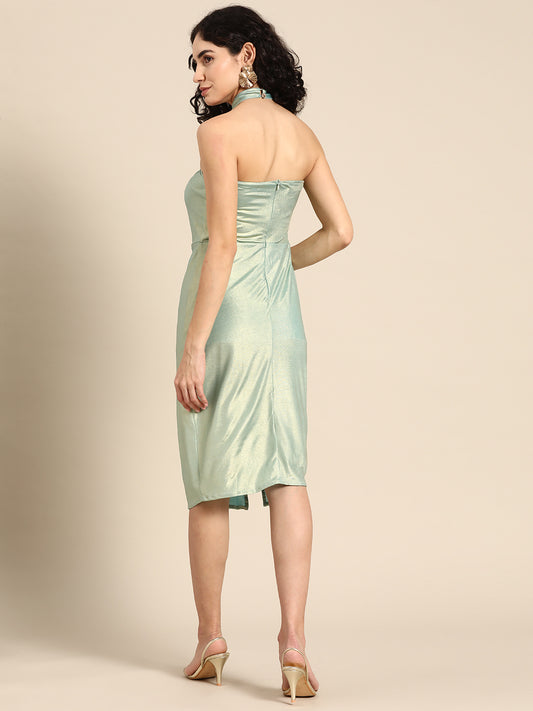 Women's Mint Green Shimmer Bodycon Dress with Front Slit and Cut-Out