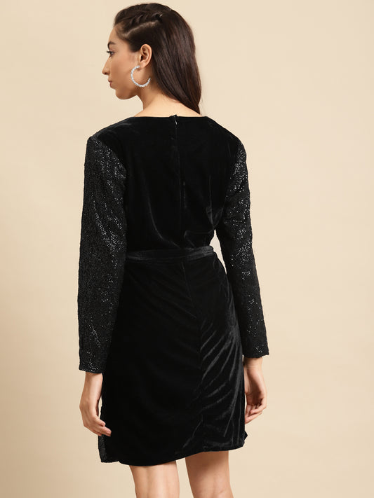 Women Black Sequin Wrap Mini Dress with Belt