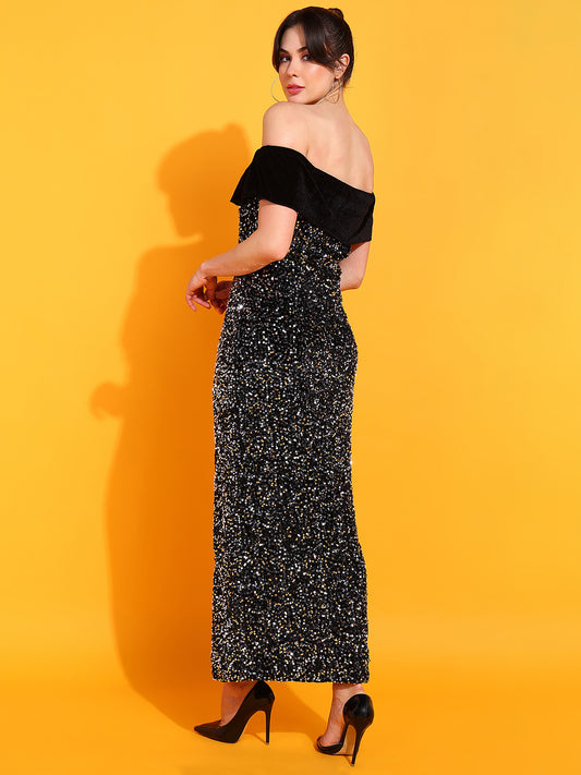 Black Off-Shoulder Sequin Maxi Dress for Women Party Evening Gown