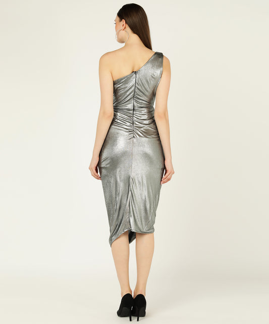 Metallic Silver One Shoulder Bodycon Ruched Midi Dress for Women