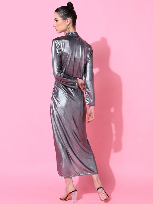 Women's Silver Metallic Bodycon Dress with Slit and Cut-Out Detail