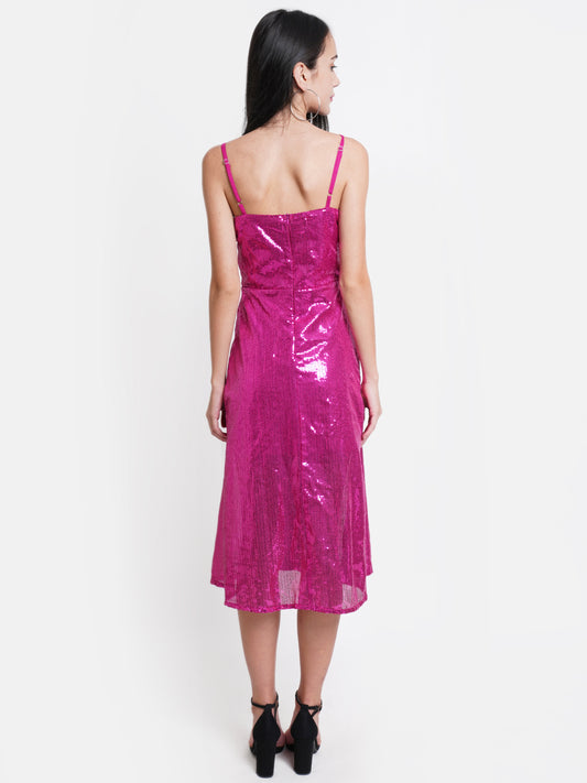 Hot Pink Sequin Midi Dress - V-Neck, Sleeveless, Party Ready
