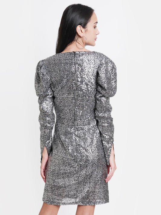 Silver Sequin Puff Sleeve Mini Dress for Women – V-Neck Party Wear Bodycon Outfit