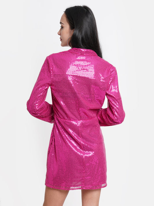 Women's Hot Pink Sequin Wrap Dress with Long Sleeves