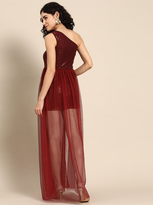 Maroon One-Shoulder Sequin Mesh Overlay Party Dress