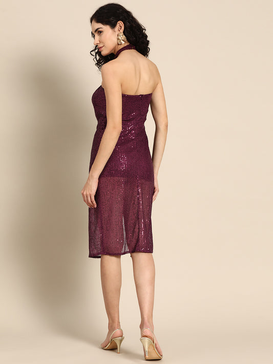 Wine Sequin Halter Neck Bodycon Dress with Slit