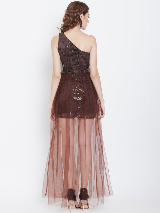 One Shoulder Sequin Brown Dress with Sheer Net Overlay