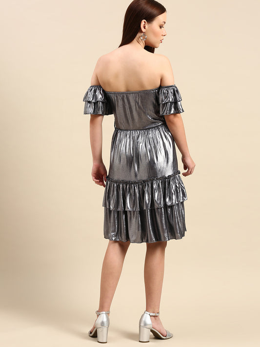 Metallic Silver Off-Shoulder Dress - Tiered Ruffles, Party Wear