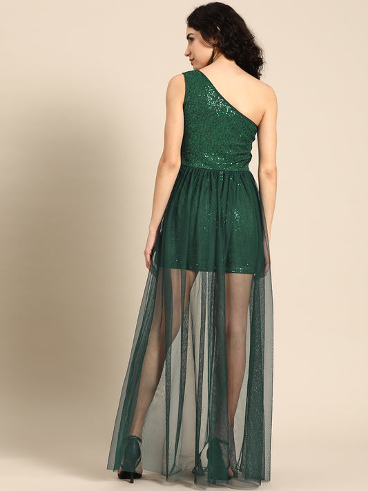 Emerald Green One-Shoulder Sequin Mesh Overlay Party Dress