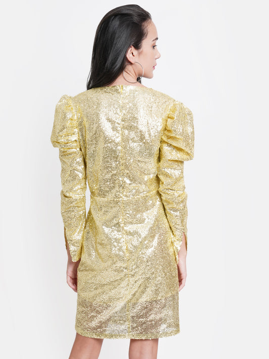 Gold Sequin Puff Sleeve Mini Dress for Women – V-Neck Glam Party Wear Outfit