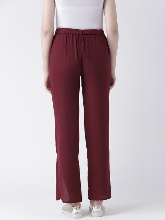 Maroon High Waist Slit Hem Trousers for Women with Tie-Up Belt