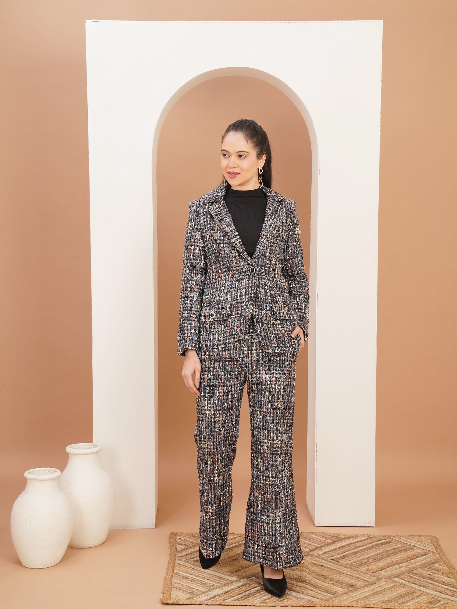 A tailored tweed co-ord set with a structured blazer and straight-fit trousers, designed for effortless confidence and refined modern elegance.
