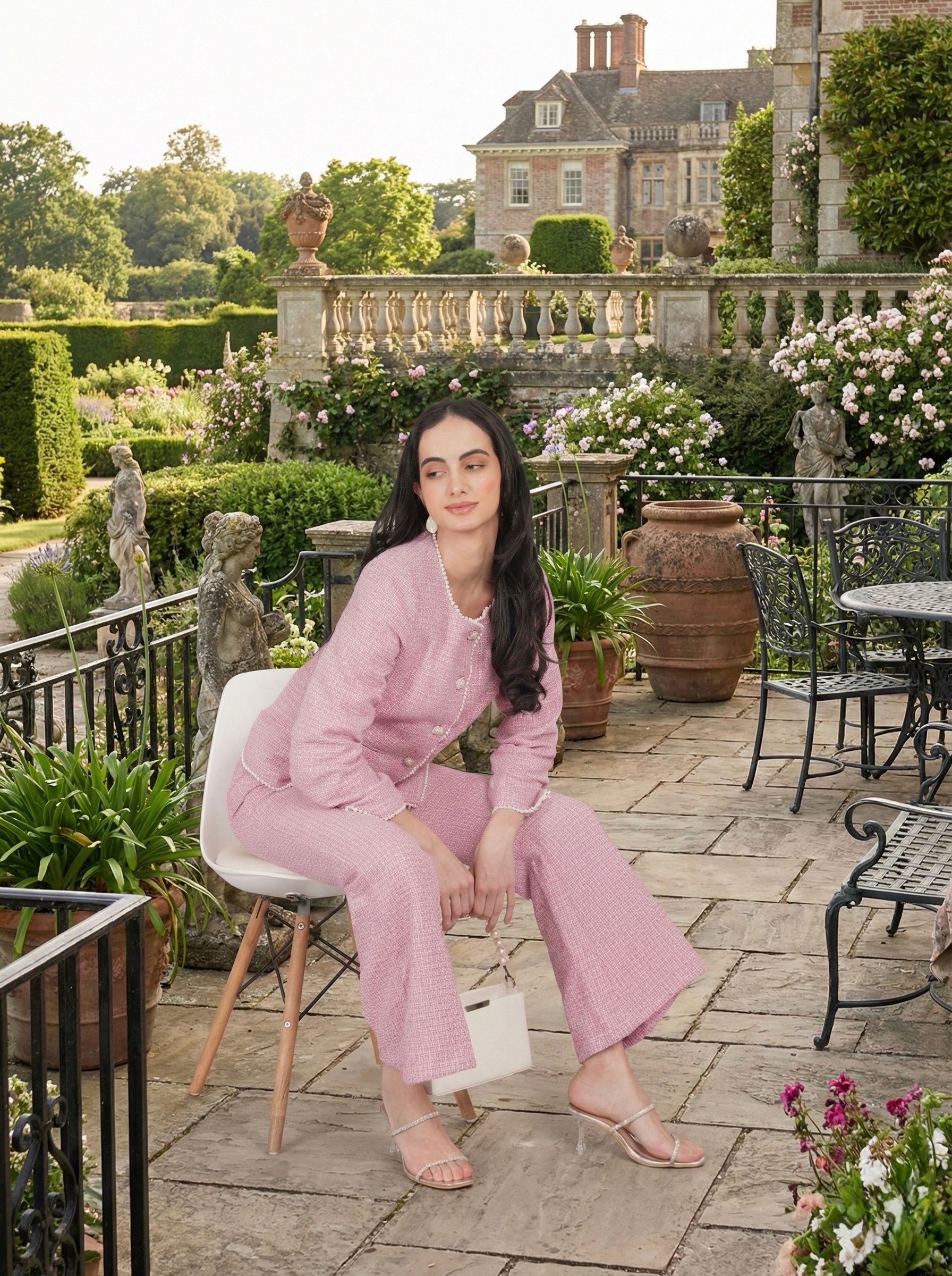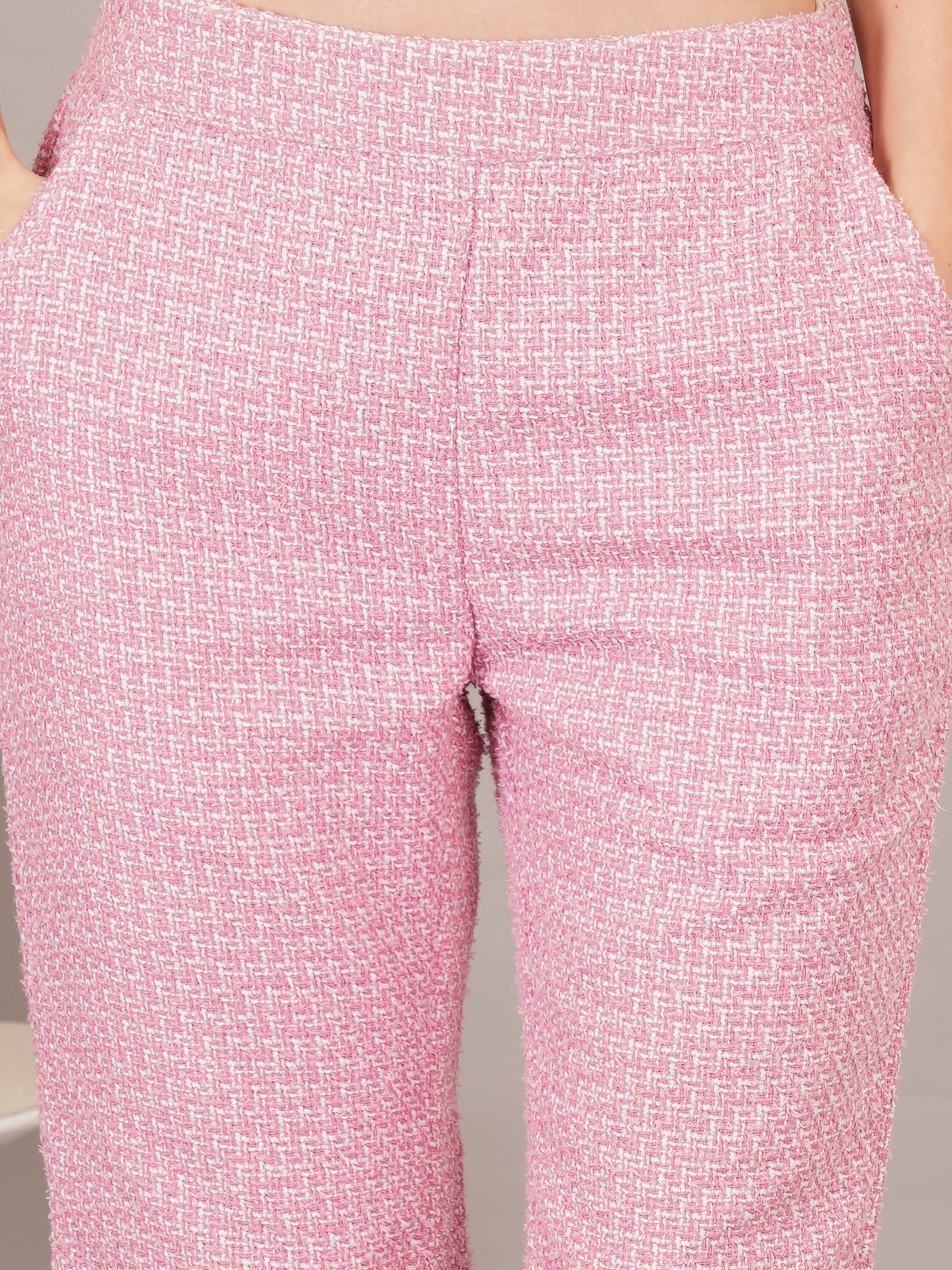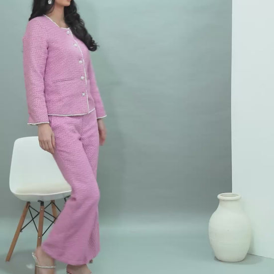 A refined pink tweed ensemble featuring a tailored jacket with pearl-style buttons and matching wide-leg trousers. Softly structured and effortlessly elegant, this set blends classic charm with a modern silhouette—perfect for chic daytime events or polished evenings.
