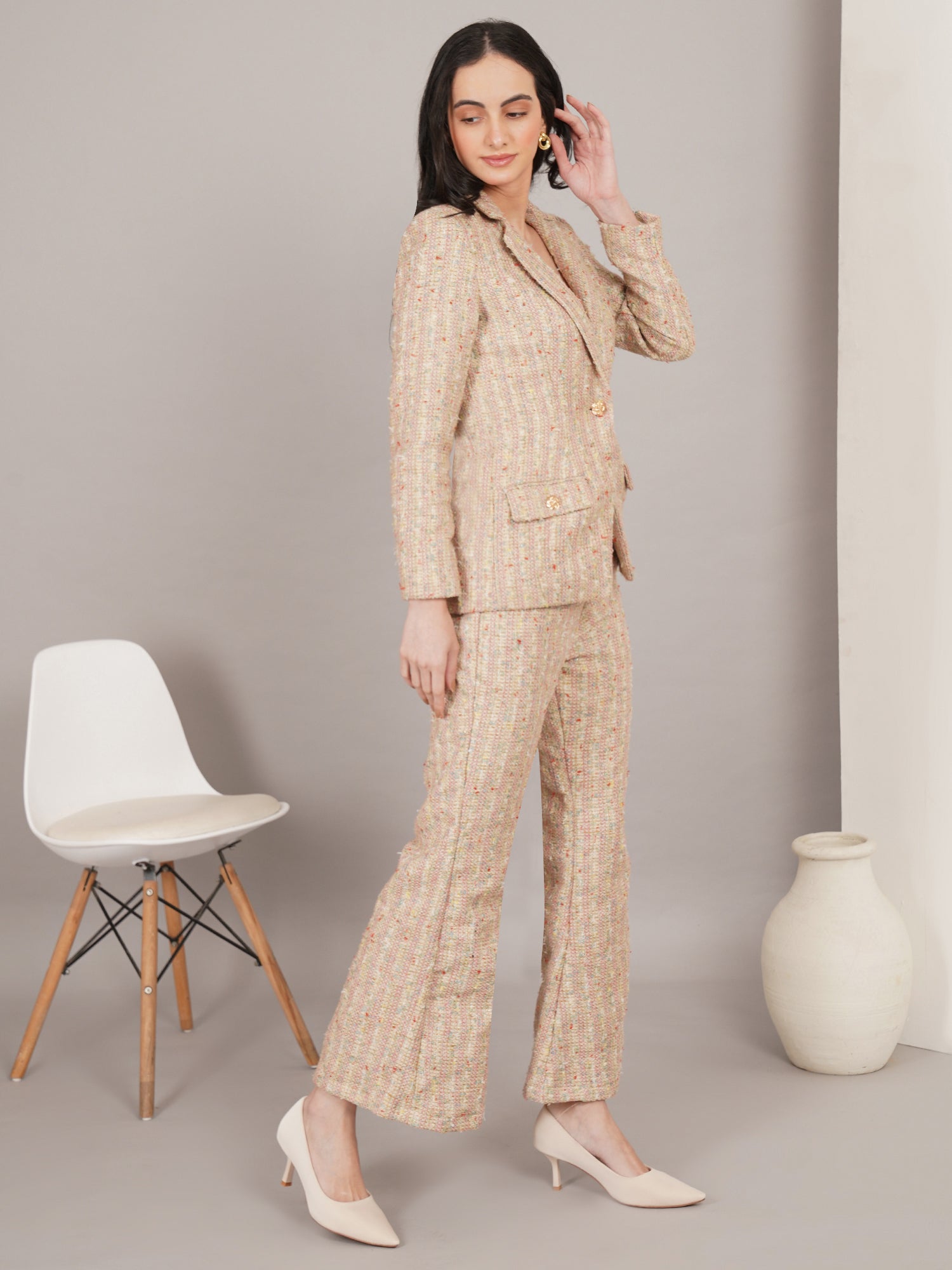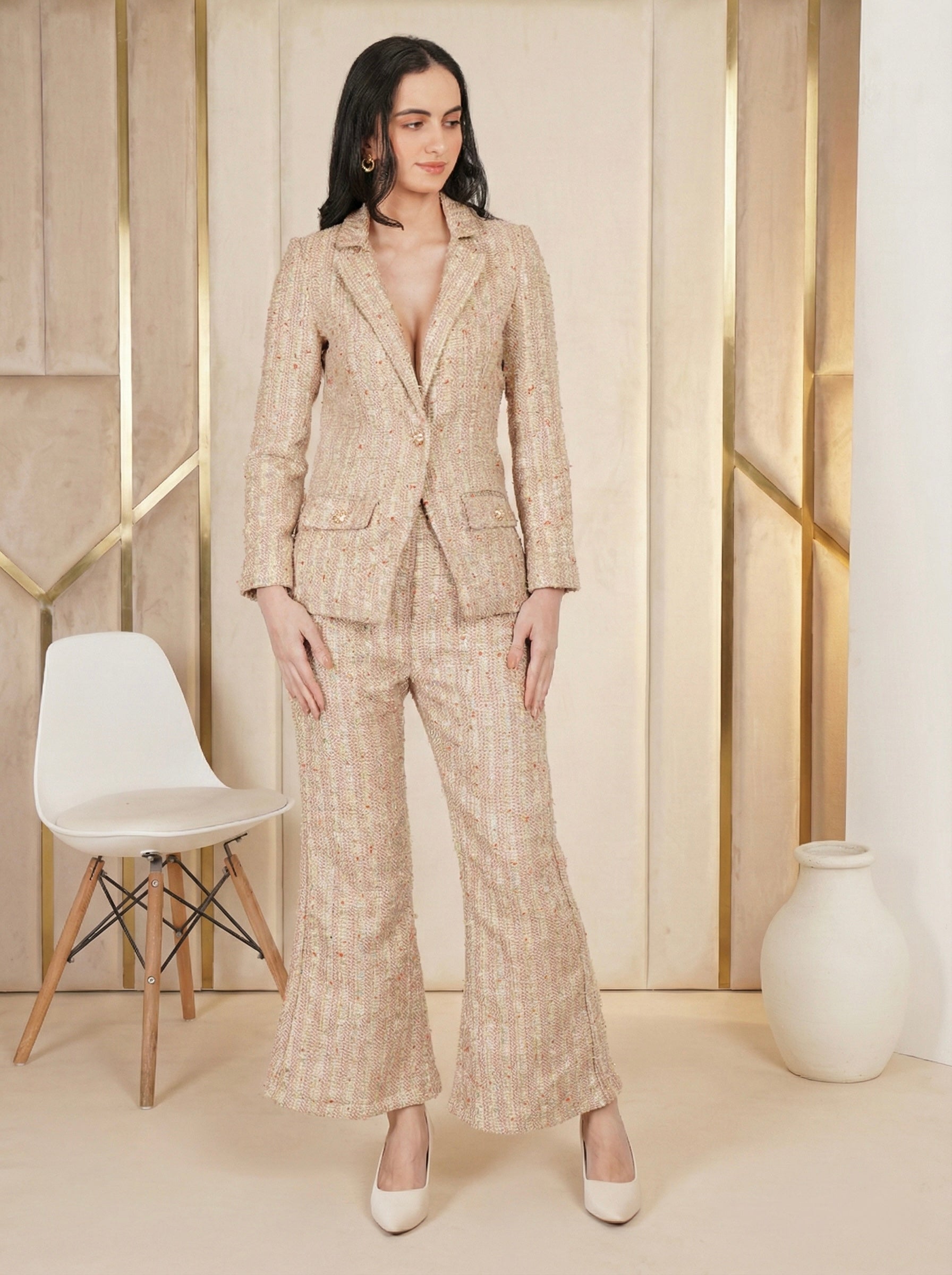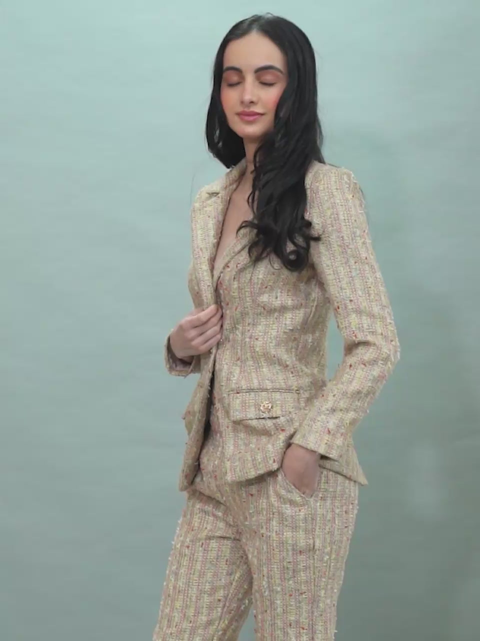 The Boho Iconique Tweed features a soft multicolor tweed with a tailored jacket and matching trousers, creating a refined yet effortless look perfect for chic daytime or smart casual wear.