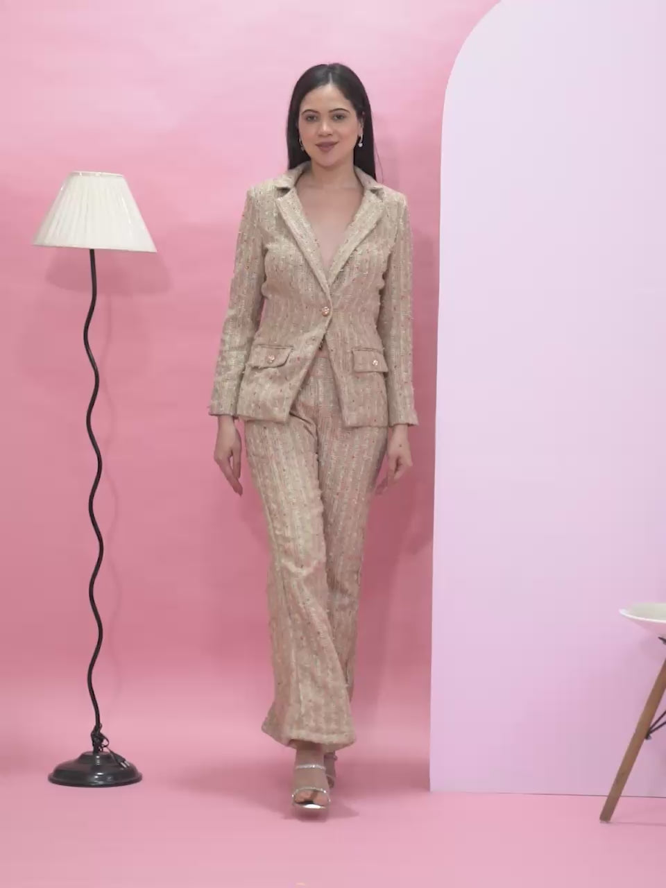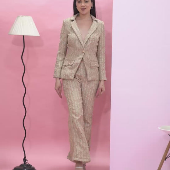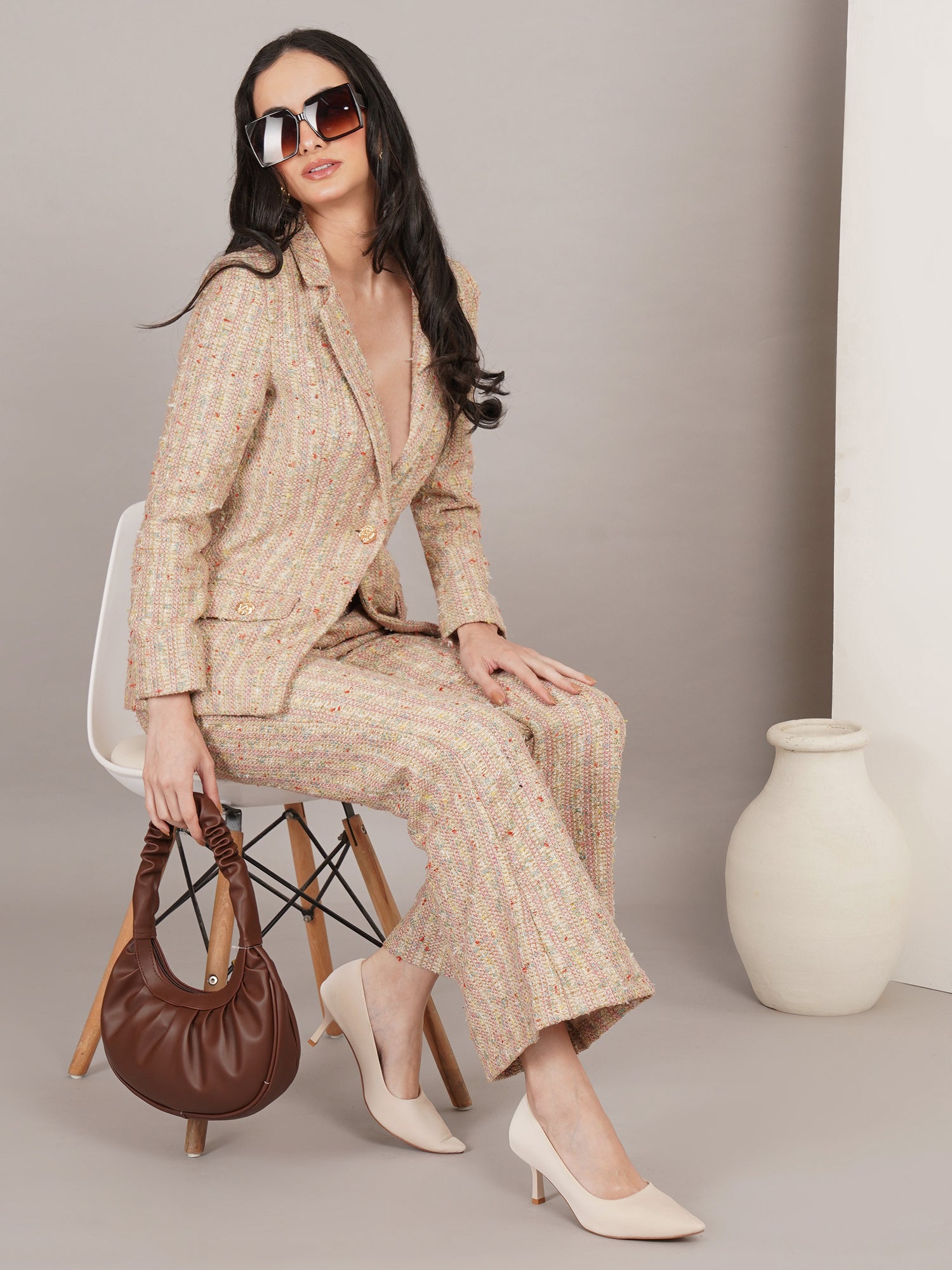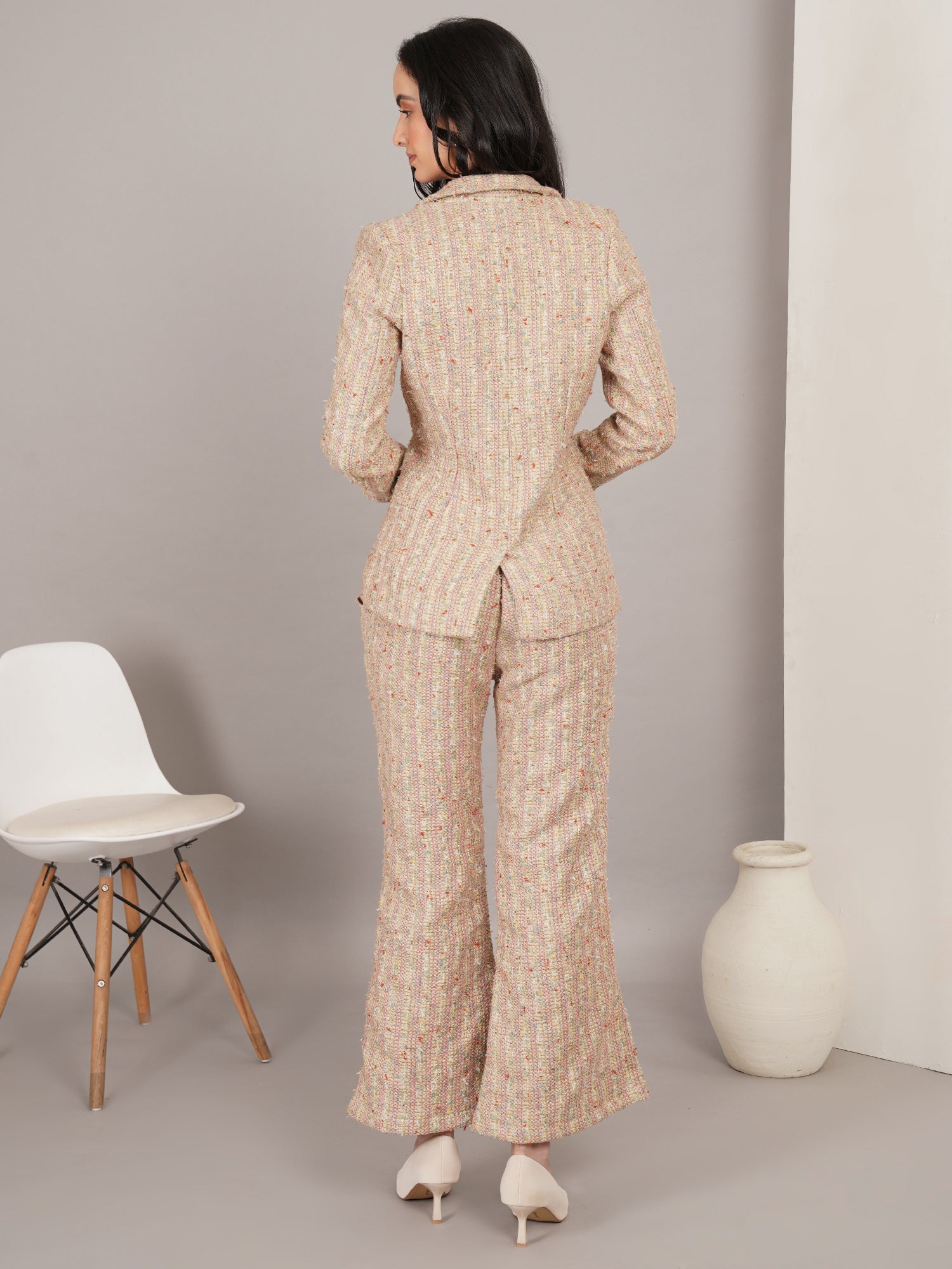 The Boho Iconique Tweed features a soft multicolor tweed with a tailored jacket and matching trousers, creating a refined yet effortless look perfect for chic daytime or smart casual wear.