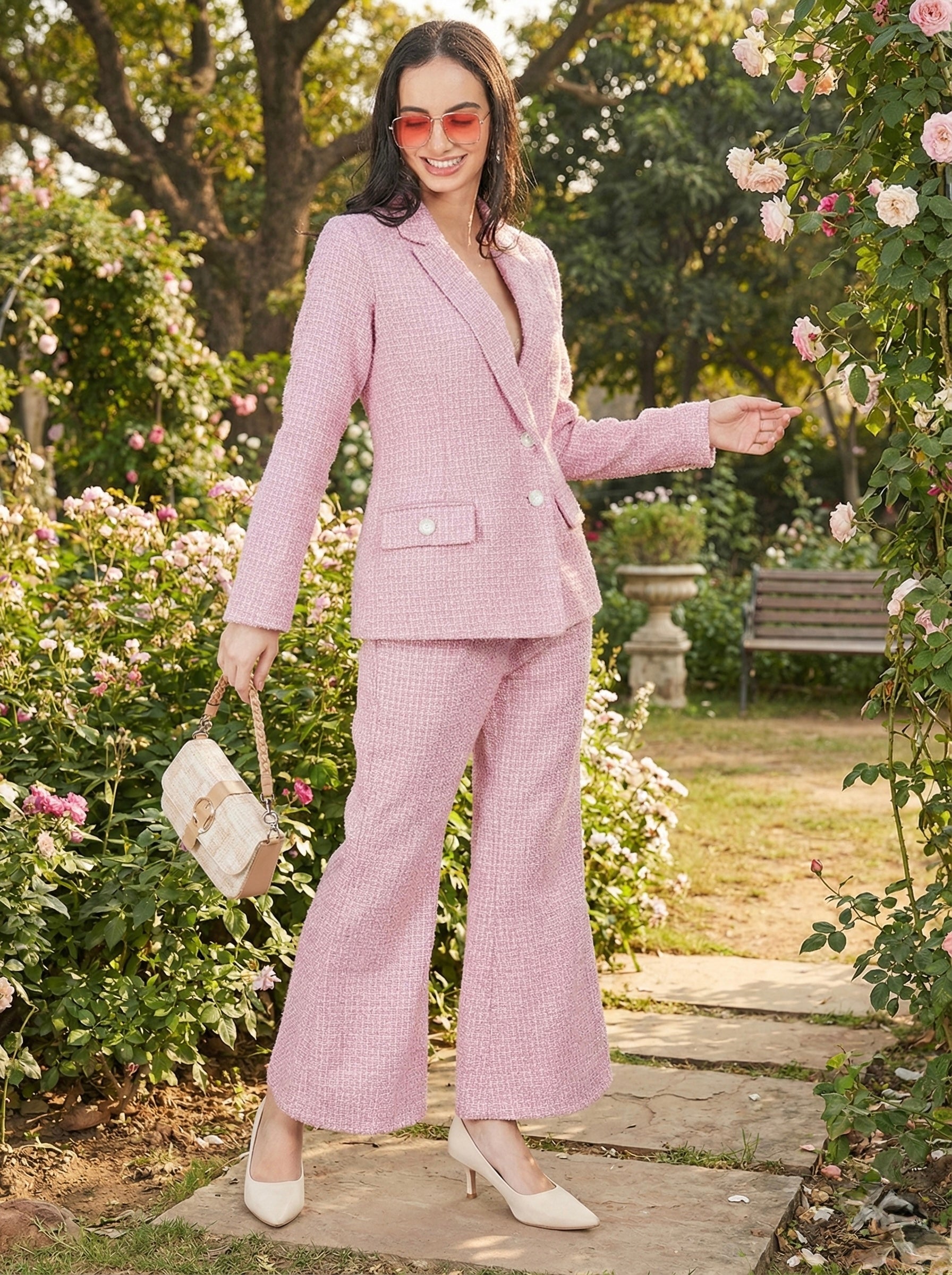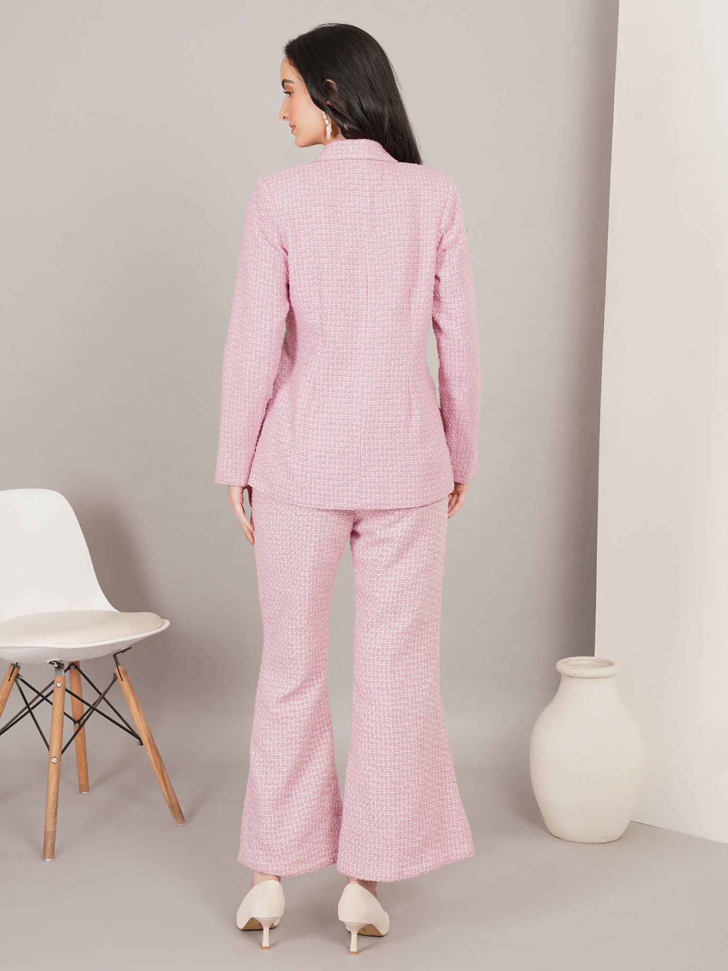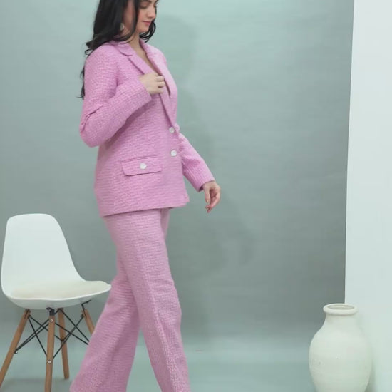 The Candy Cane Tweed Set is a chic two-piece featuring a structured blazer and flattering wide-leg trousers in a soft pink tweed. With its clean lines and polished texture, this set offers a perfect balance of elegance and modern style—ideal for refined daytime looks or sophisticated evenings.
