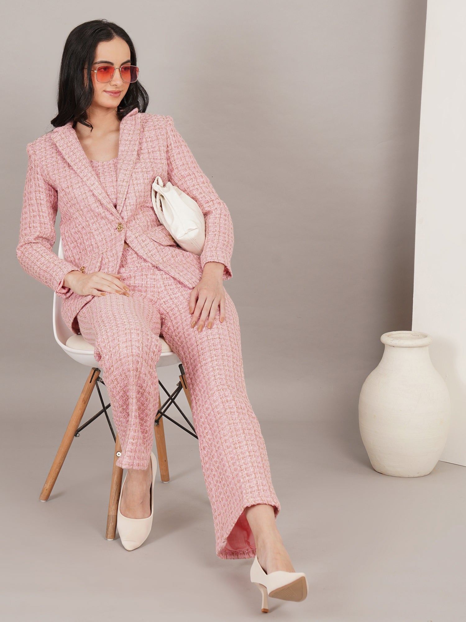 Coco Blanc Tweed Set is a chic, feminine ensemble crafted in soft blush tweed with a refined texture. Featuring a tailored blazer with gold-tone accents and matching wide-leg trousers, this set embodies effortless elegance and timeless sophistication—perfect for polished daytime looks or elevated occasions.