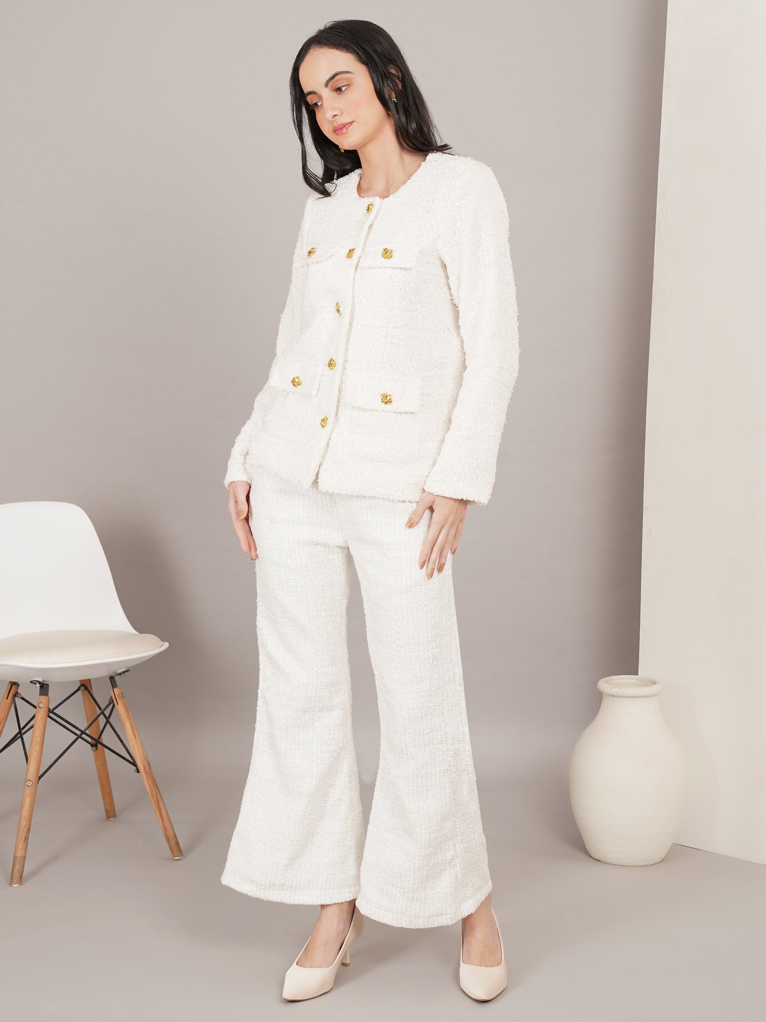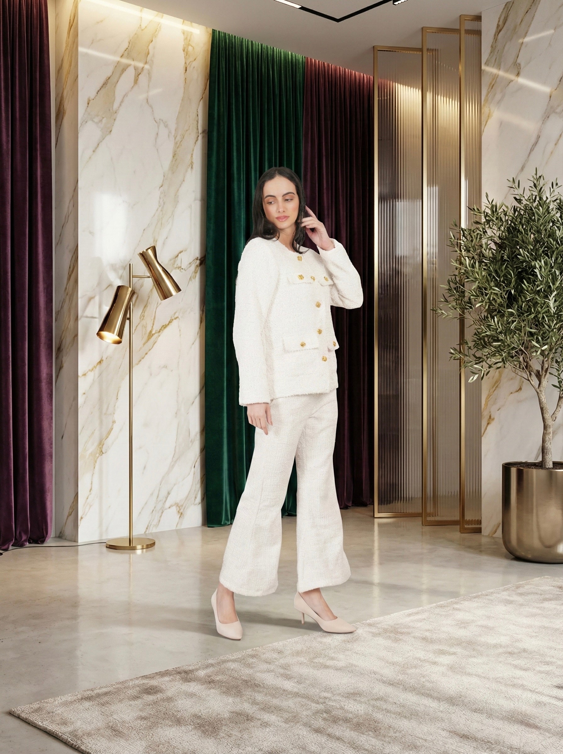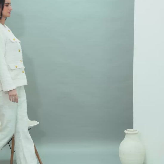 coco snow Tweed is a timeless two-piece ensemble in a soft snow-toned tweed with a delicate pearly sheen. Featuring a classic buttoned jacket with subtle fringe details and matching flared trousers, it delivers effortless elegance and refined sophistication for both daytime and evening occasions.