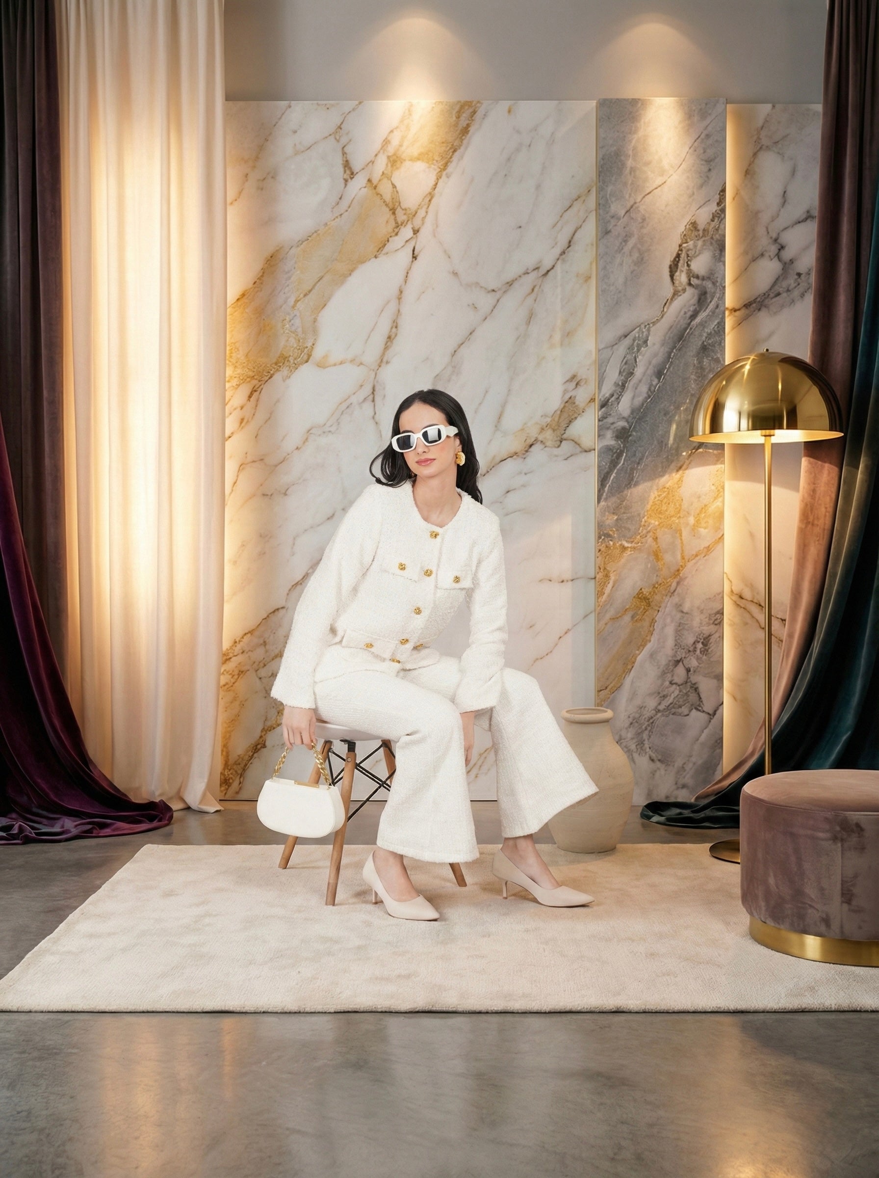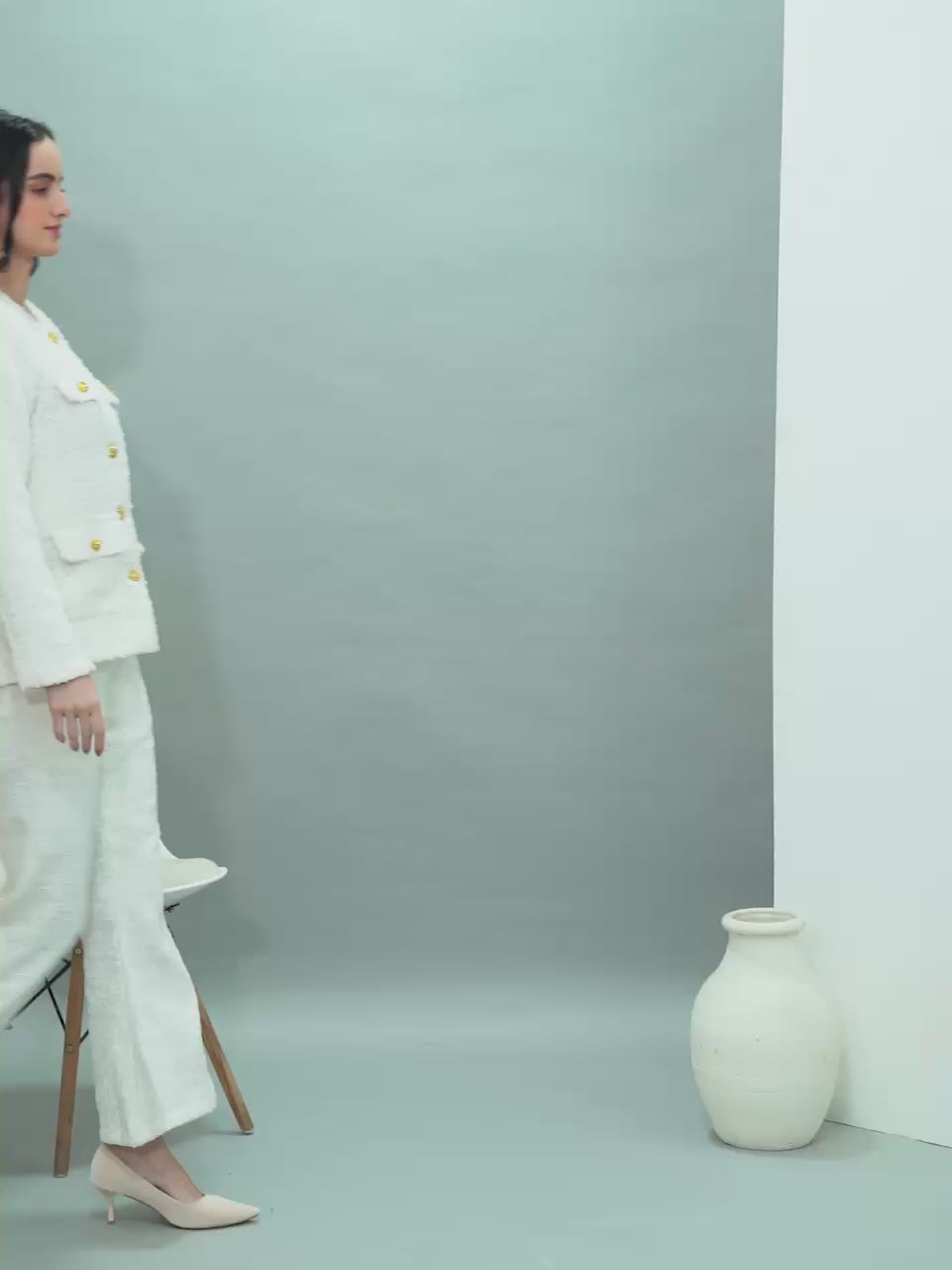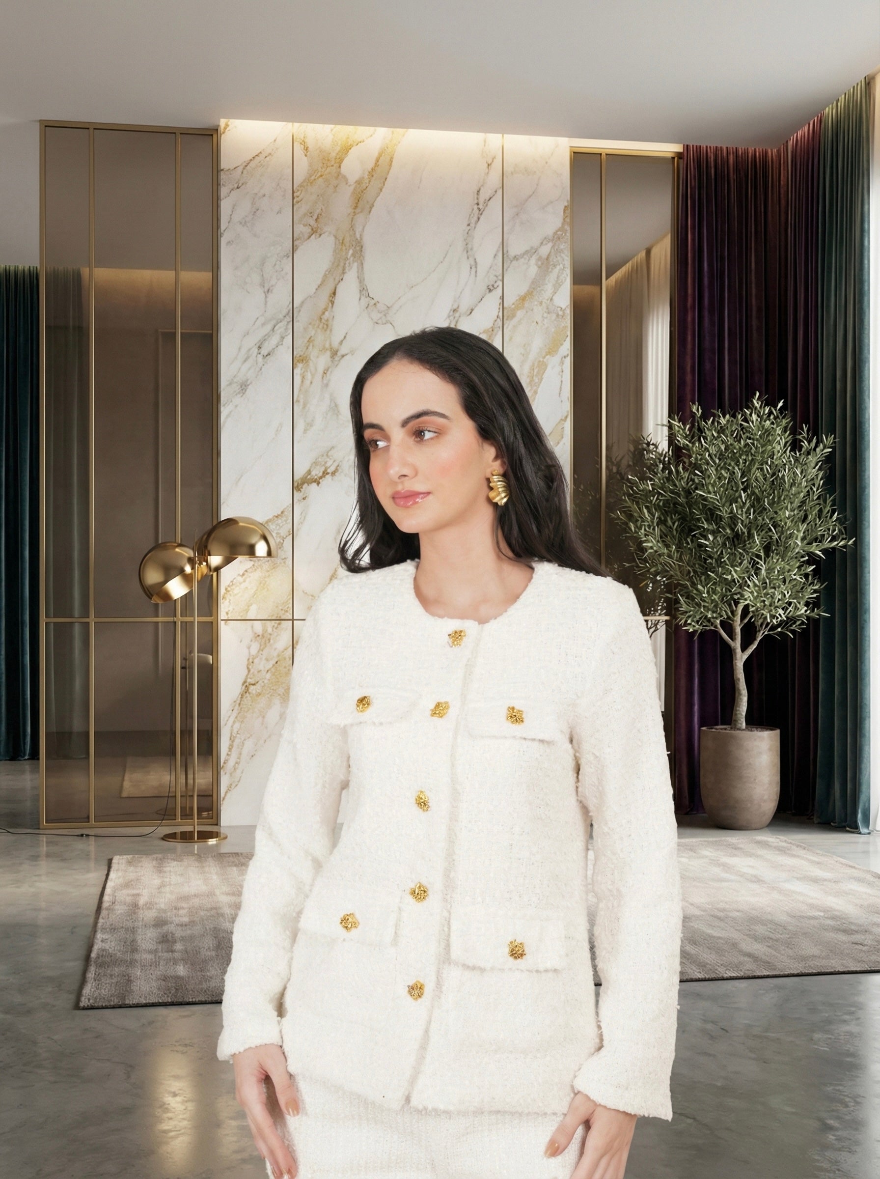 coco snow Tweed is a timeless two-piece ensemble in a soft snow-toned tweed with a delicate pearly sheen. Featuring a classic buttoned jacket with subtle fringe details and matching flared trousers, it delivers effortless elegance and refined sophistication for both daytime and evening occasions.