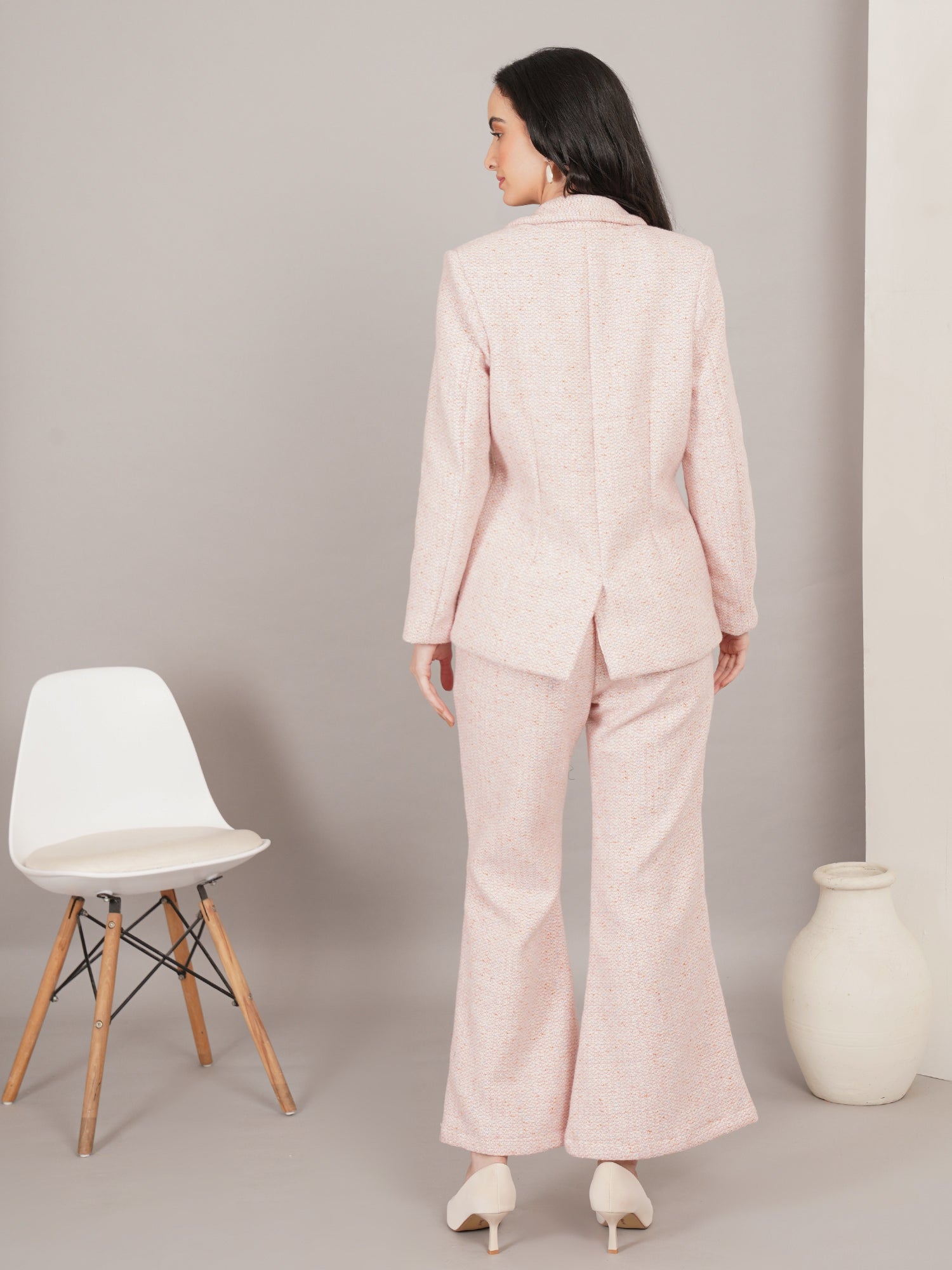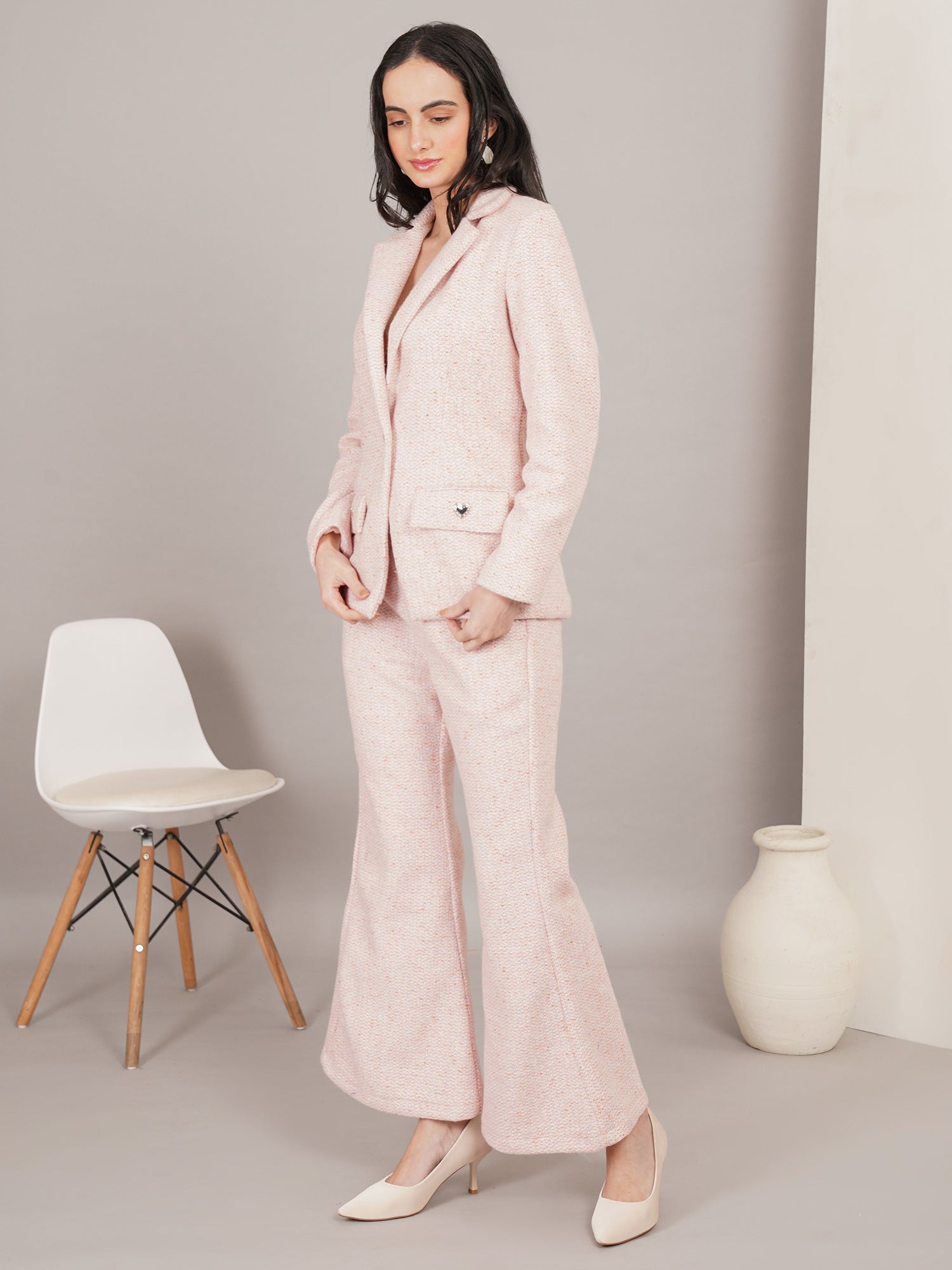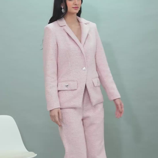 The Cotton Candy Tweed Set is a soft, elegant two-piece featuring a tailored tweed blazer and wide-leg trousers in a delicate blush pink hue. Crafted for comfort and sophistication, it blends classic structure with a modern, feminine charm—perfect for polished daytime looks or chic evening outings.