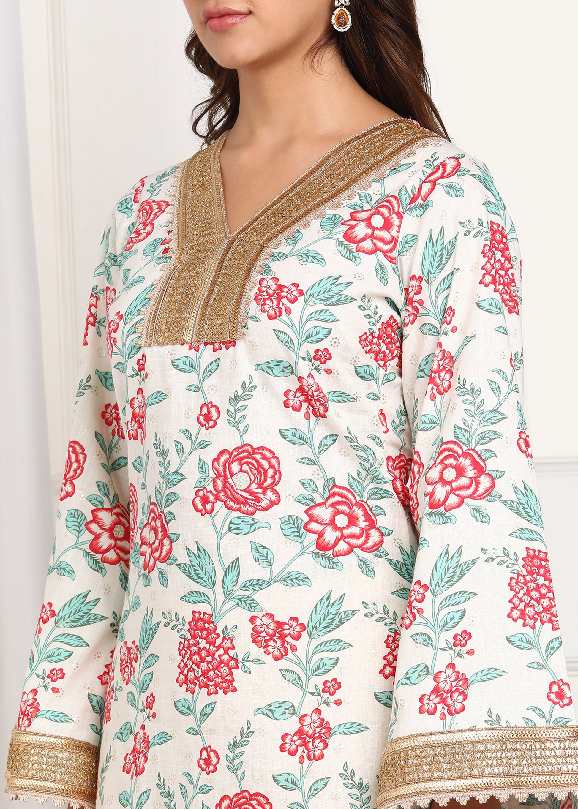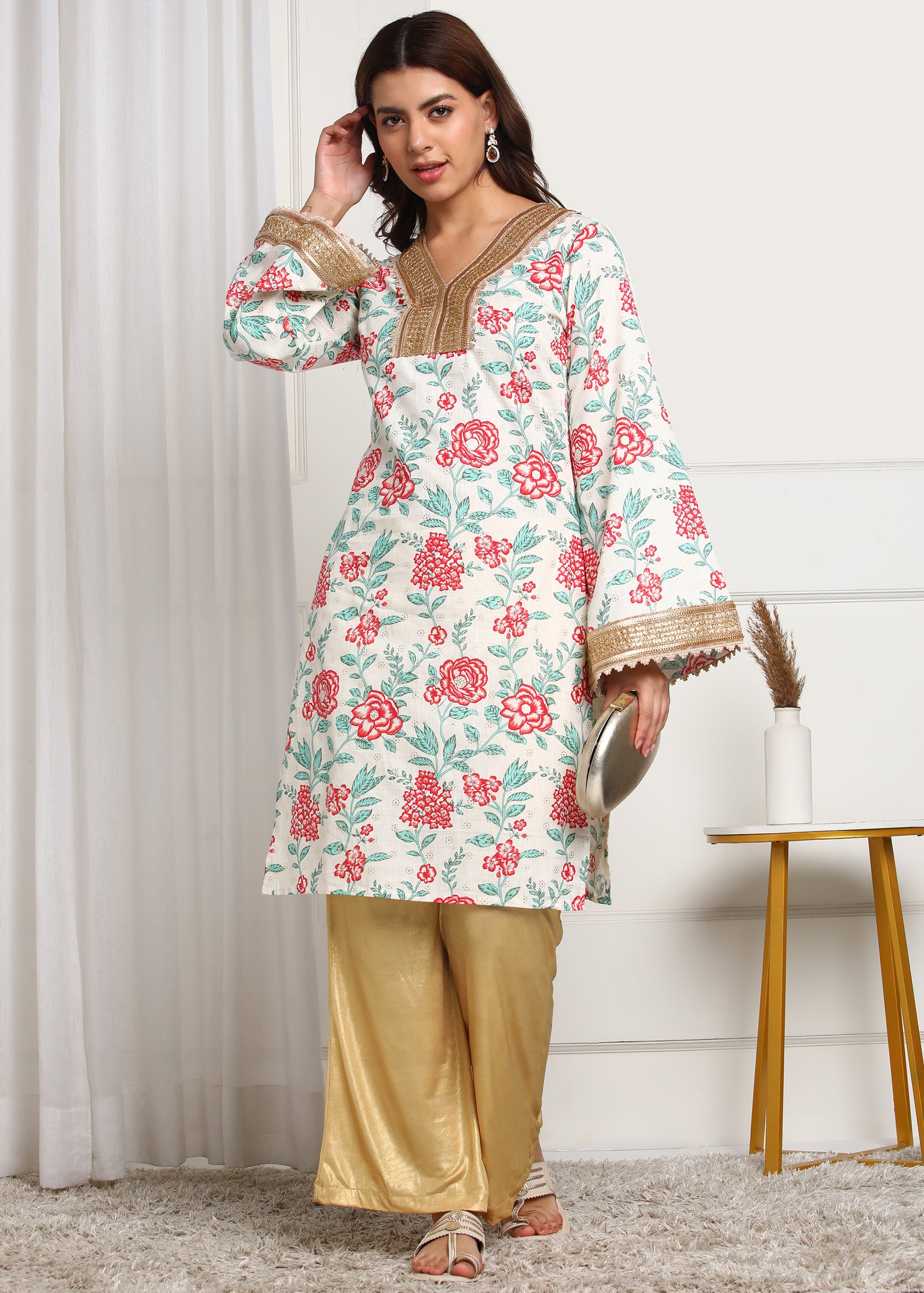 Floral Printed White Kurta with Golden Detailing | Ethnic Wear for Women