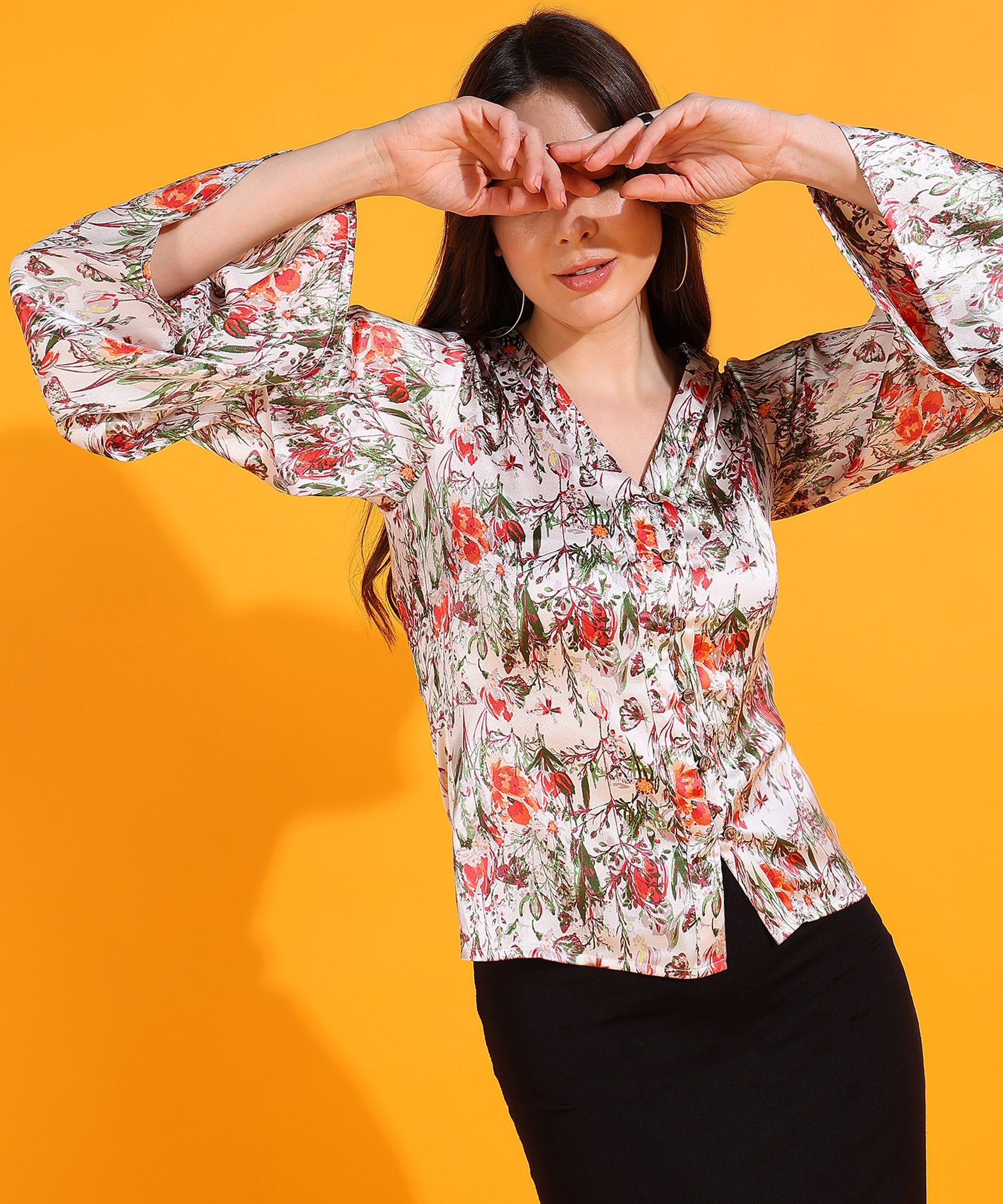 Floral Satin Button-Down Top with Flared Sleeves – Casual & Office Wear