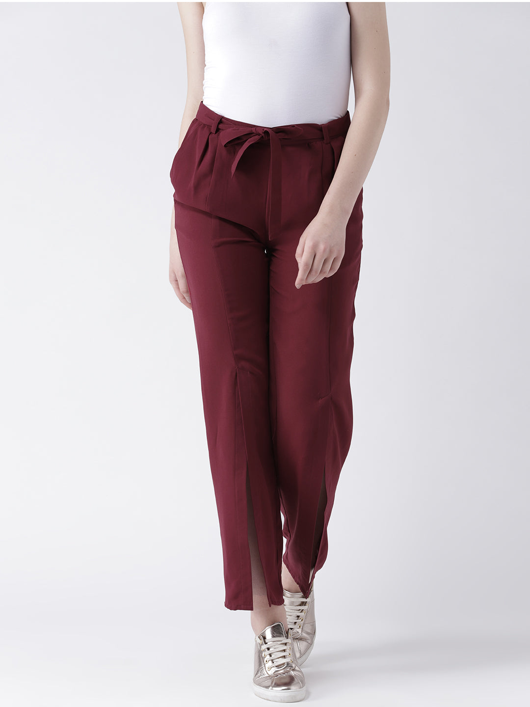 Maroon High Waist Slit Hem Trousers for Women with Tie-Up Belt