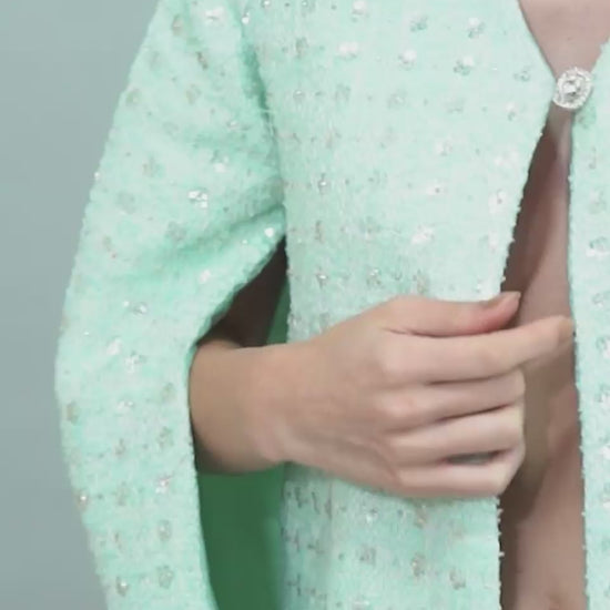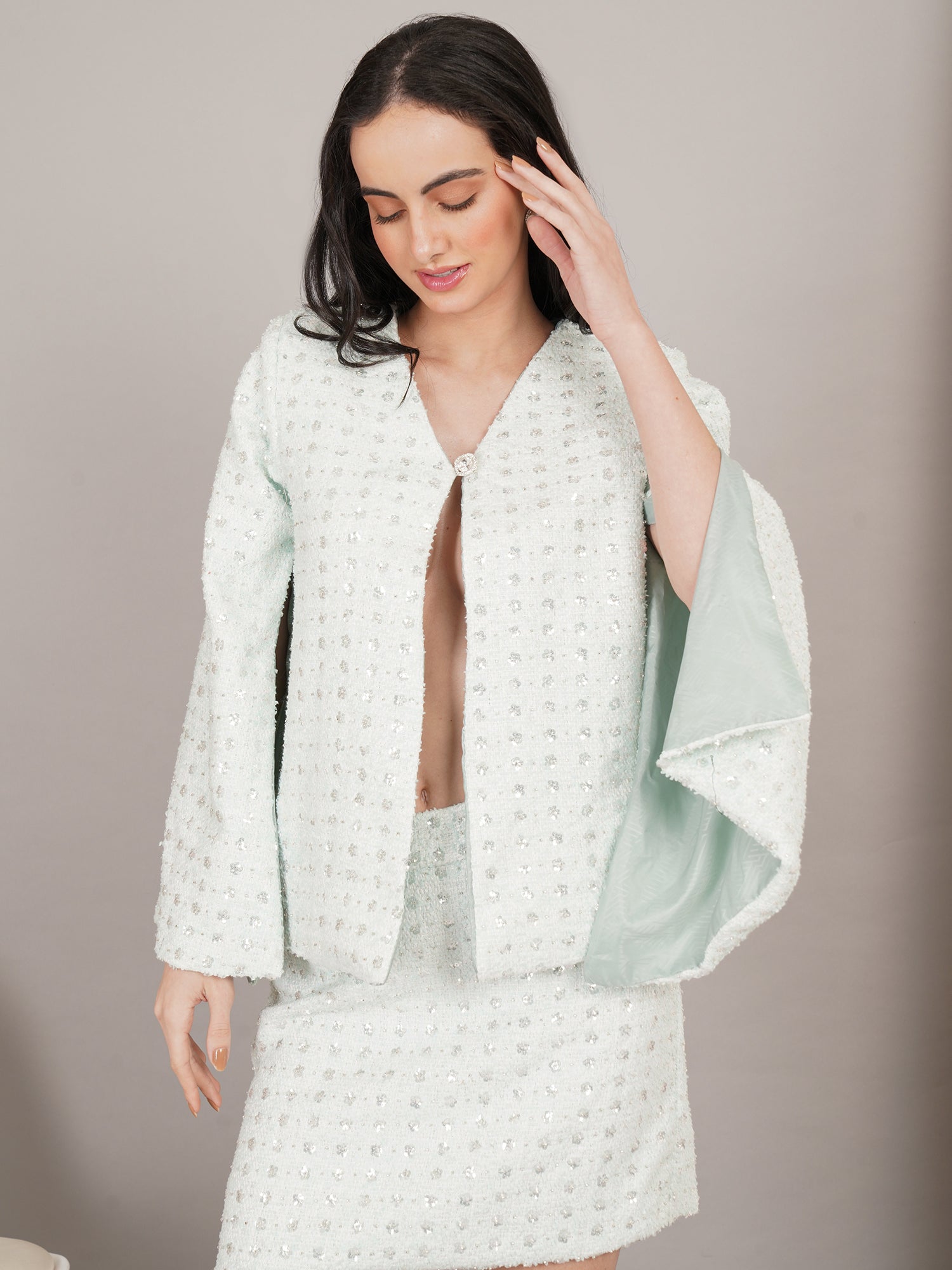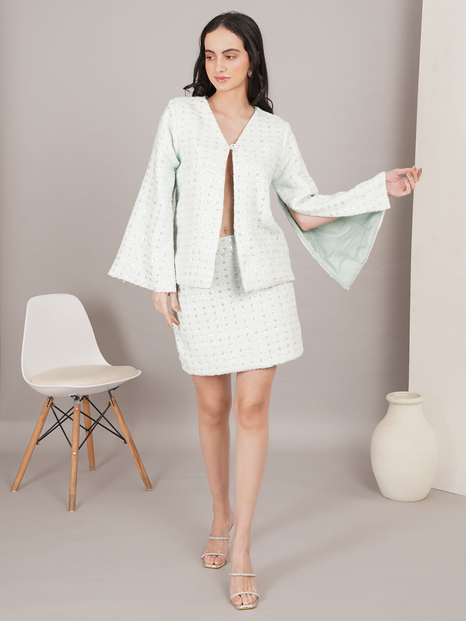 The Mint Veil Tweed Set features a softly textured tweed jacket paired with a matching skirt in a fresh mint hue. Elegant and lightweight, it offers a refined silhouette with subtle detailing—perfect for daytime events, brunches, or polished evening gatherings.
