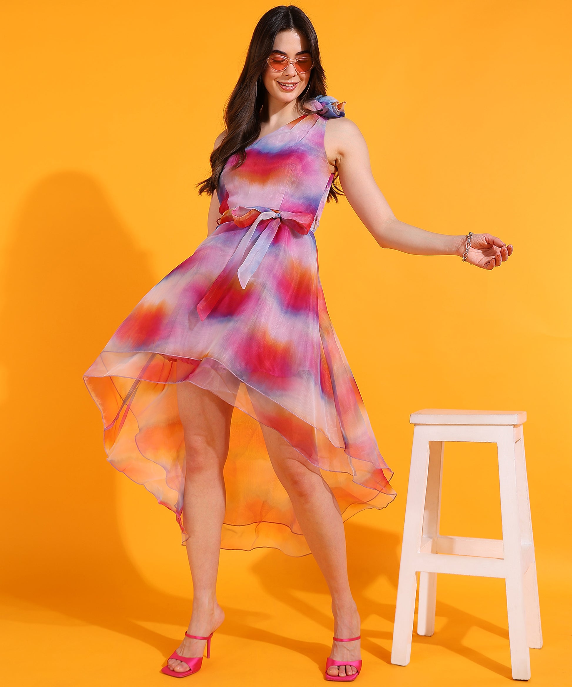 Stand out in style with this multicolor one shoulder high low dress featuring a flowy layered hem and waist tie belt. Perfect for parties, cocktail evenings, beach vacations, and special occasions. A trendy and elegant dress for women who love vibrant fashion.