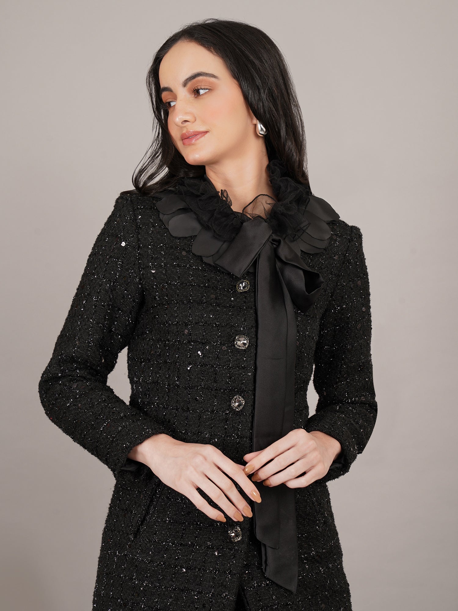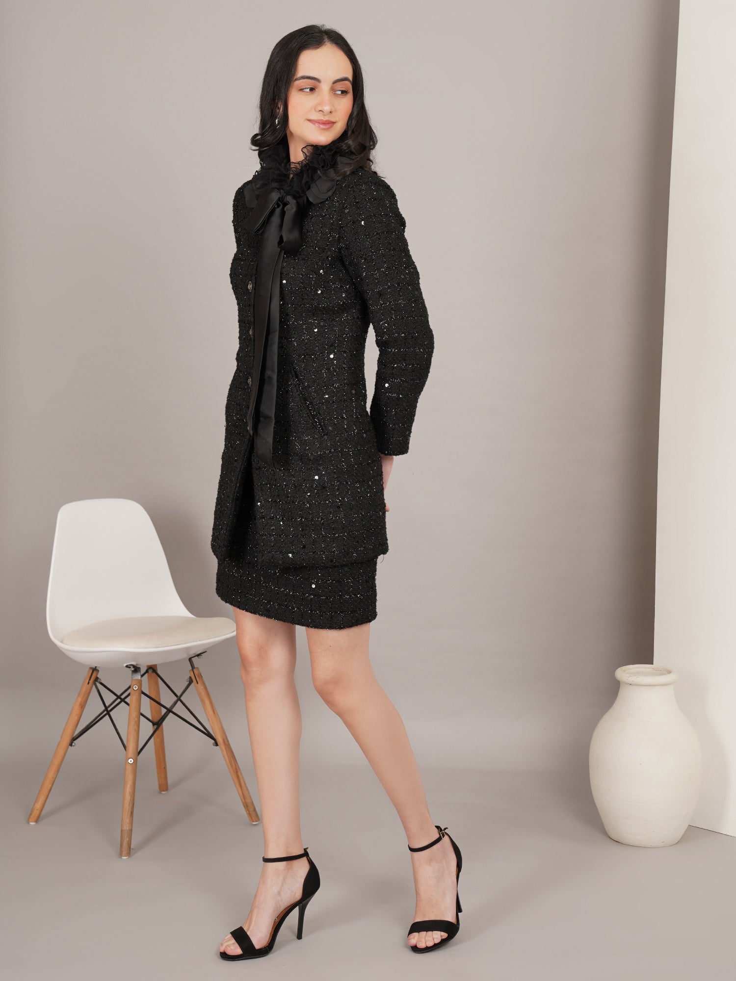 Noir de Paris is a timeless black tweed dress set infused with Parisian elegance. Featuring subtle shimmer, classic button detailing, and a soft bow accent at the neckline, it delivers a refined silhouette that effortlessly transitions from sophisticated daytime wear to chic evening occasions.