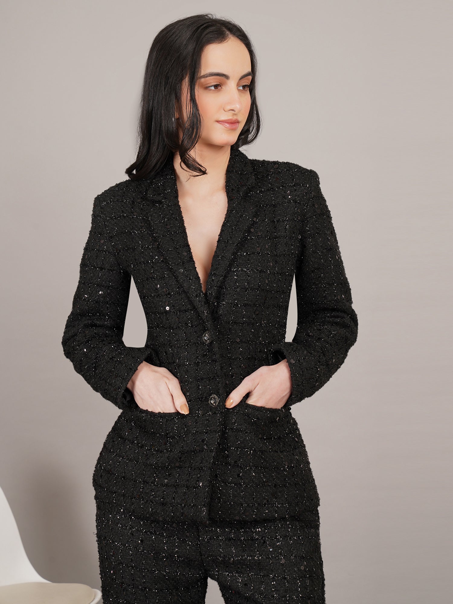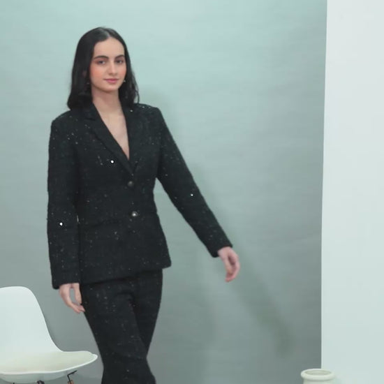 A sleek black tweed ensemble with a subtle shimmer, featuring a structured jacket and matching wide-leg trousers. Tailored and timeless, this refined set delivers effortless sophistication for evening occasions or elevated formal wear.