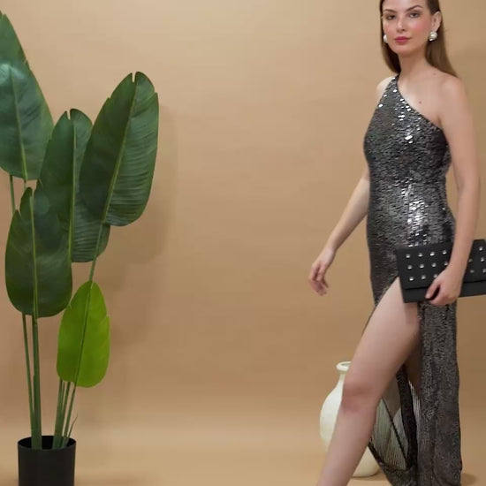 One Shoulder Black Sequin Slit Gown for Women – Elegant Party & Evening Dress