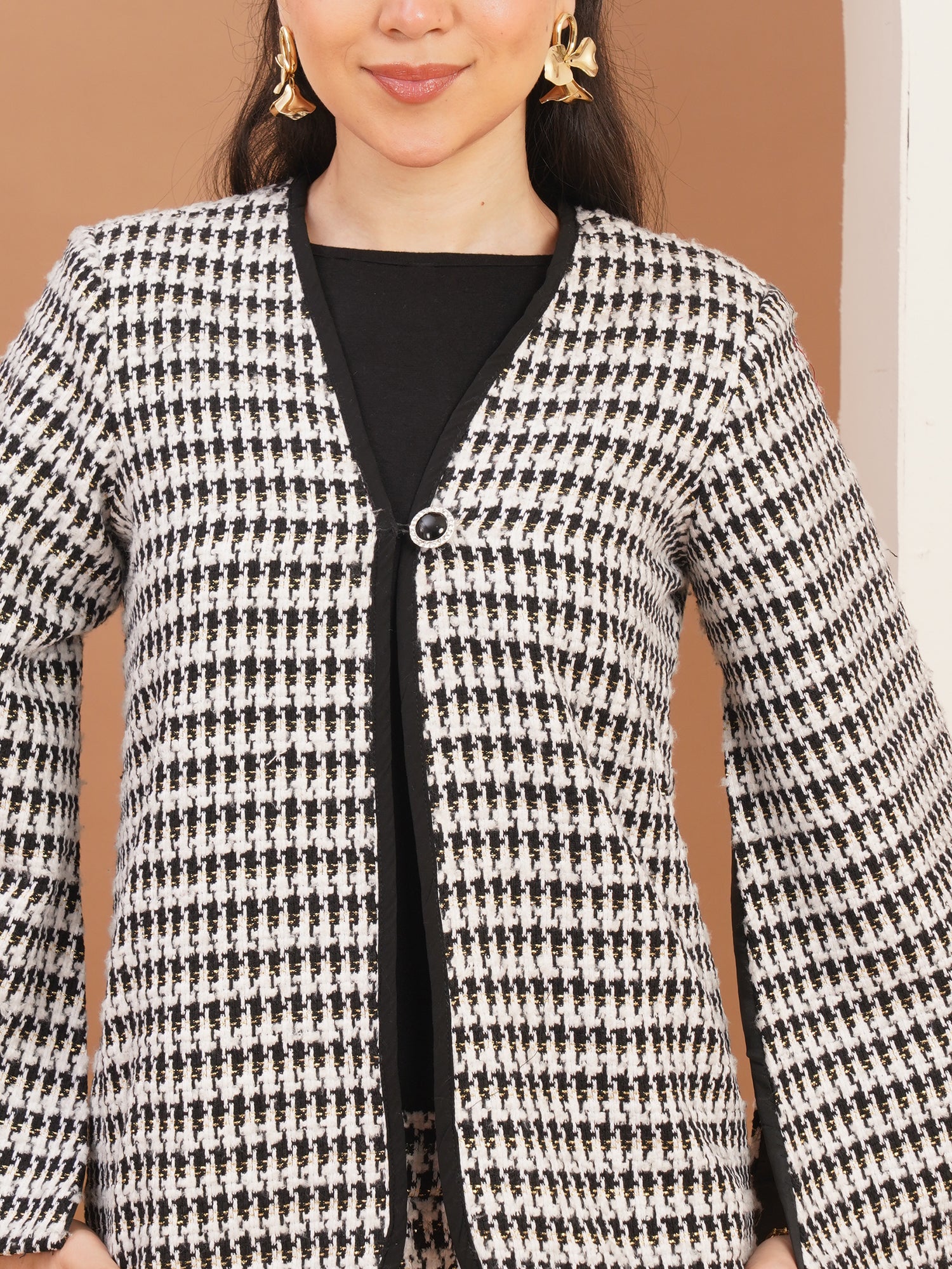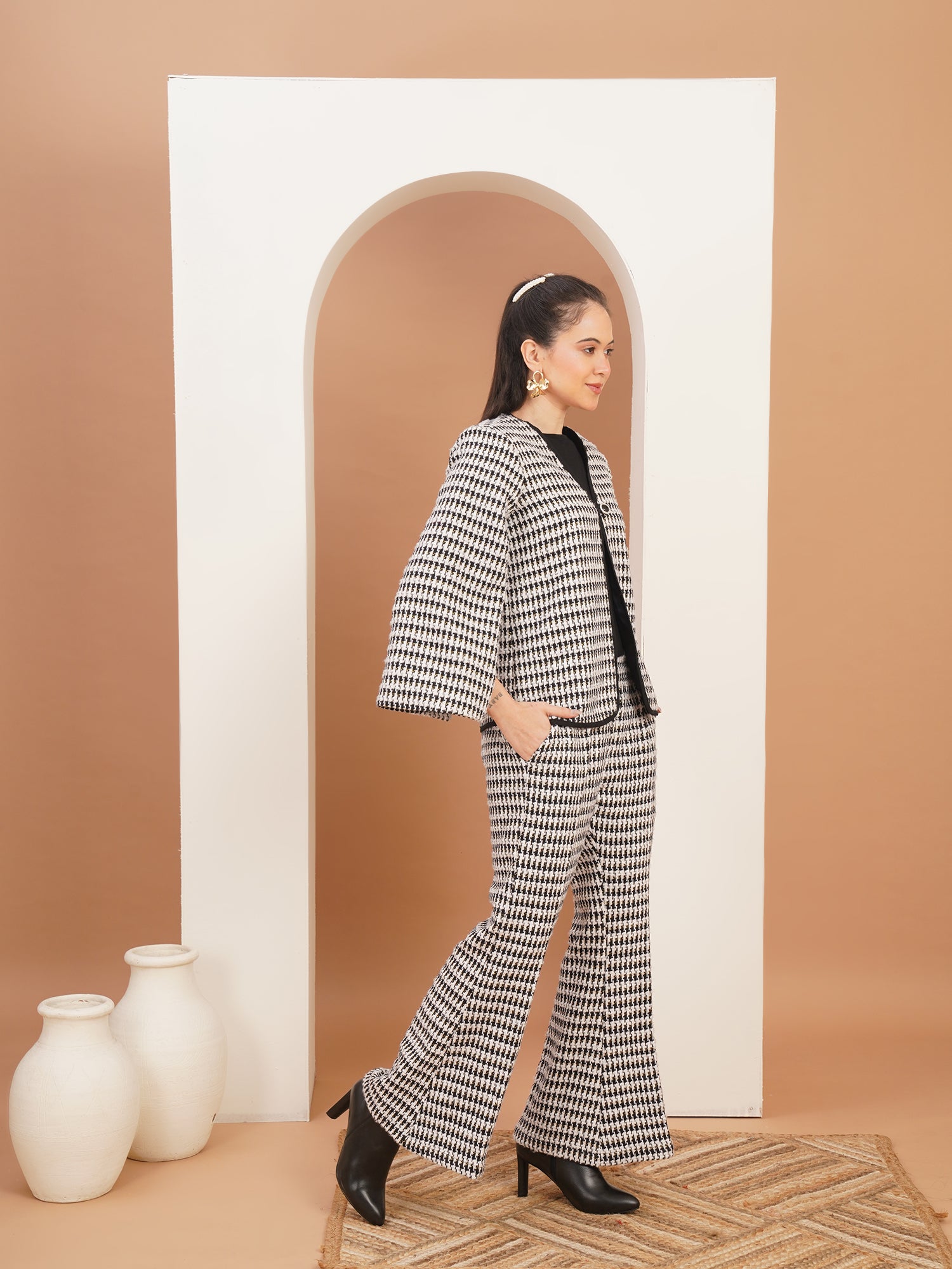 A classic black-and-white tweed co-ord featuring a clean-cut jacket and flared trousers, offering timeless elegance with a modern, polished edge.