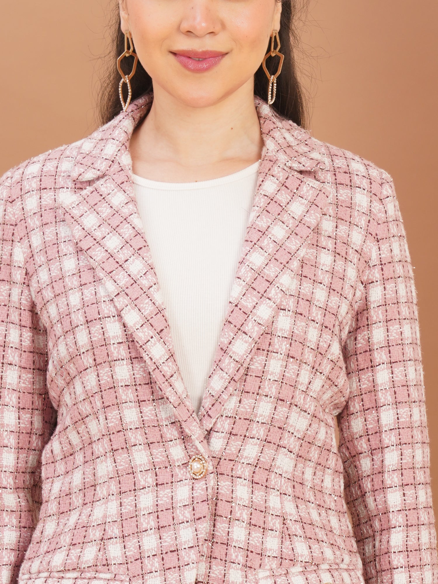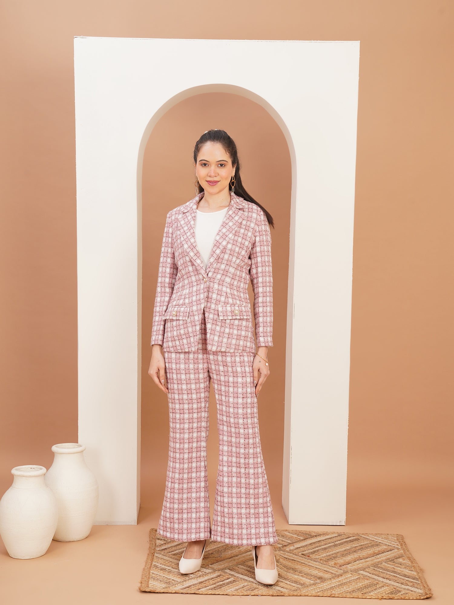 A refined two-piece co-ord set crafted in soft blush pink tweed, featuring a tailored blazer with flap pockets and matching wide-leg trousers. Designed to deliver a polished yet feminine look, this set is ideal for office wear, formal meetings, or elegant daytime occasions.