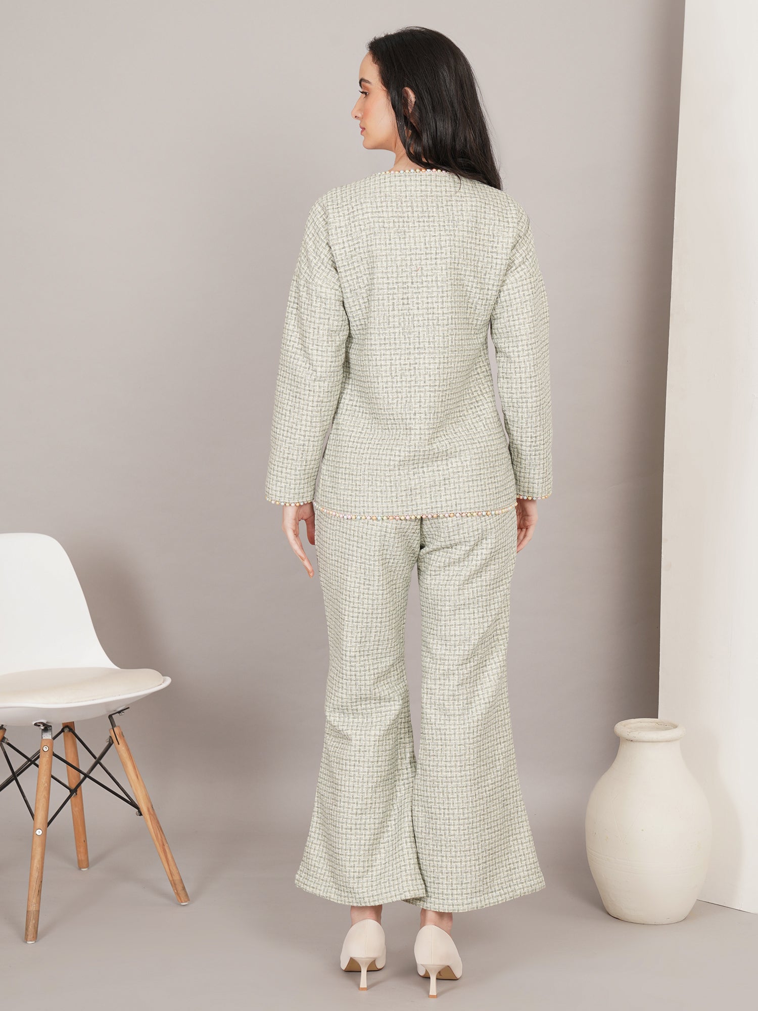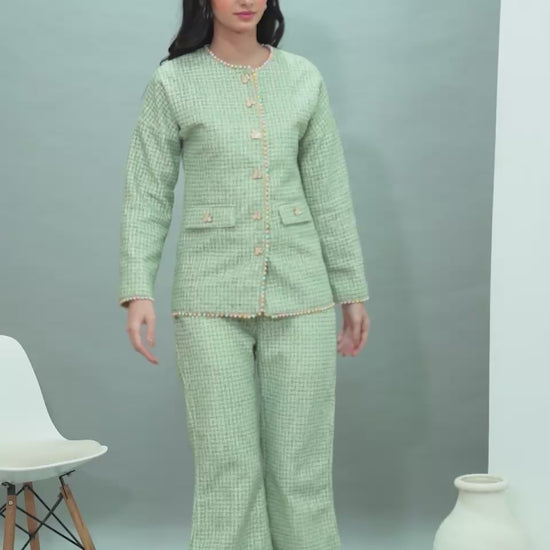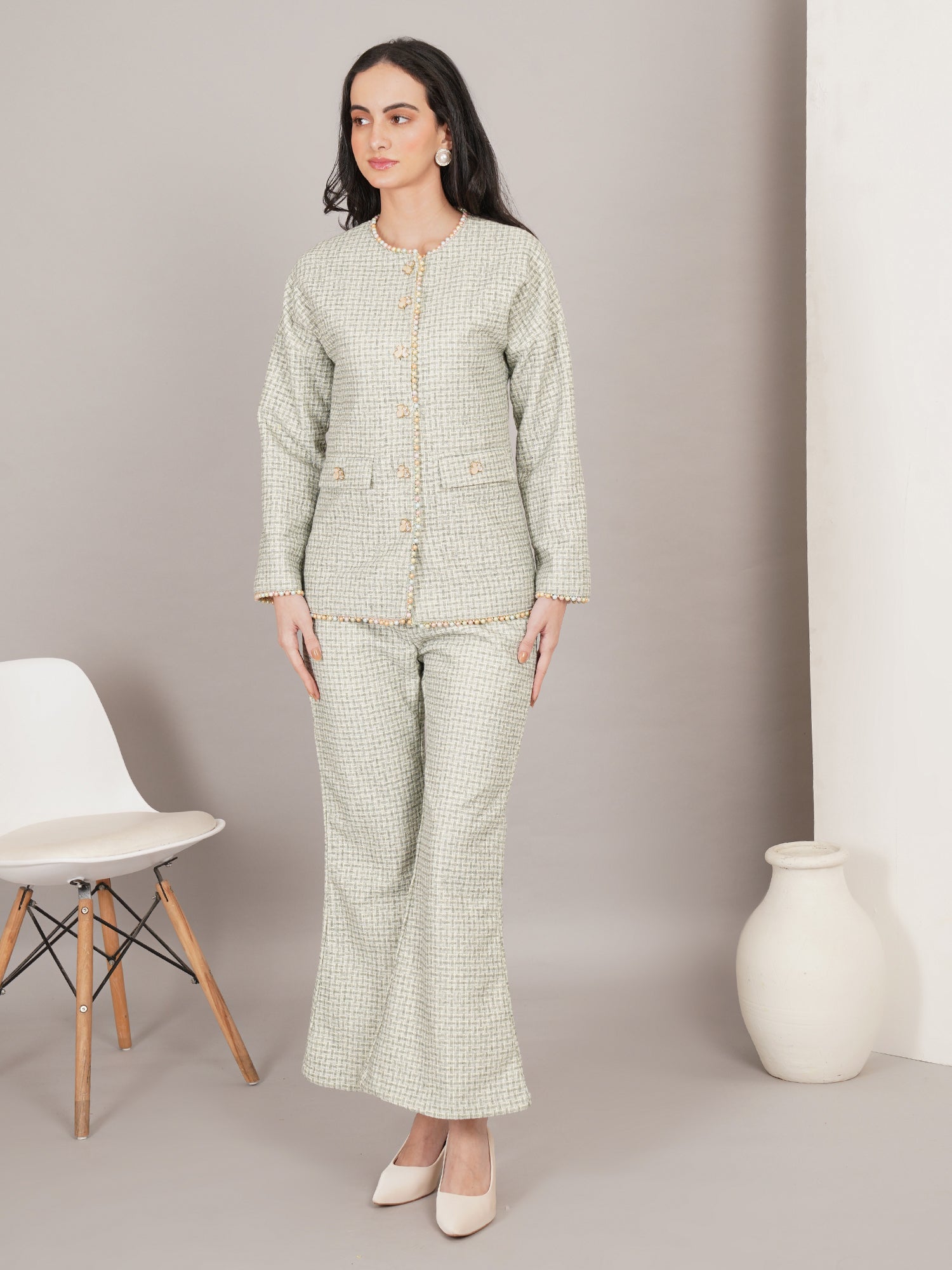 Willow Green Tweed Set is a graceful two-piece ensemble in soft green tweed, designed with a clean round neckline and delicate button detailing. Paired with matching tailored trousers, this set offers understated elegance and a timeless silhouette—ideal for refined daywear and polished occasions.