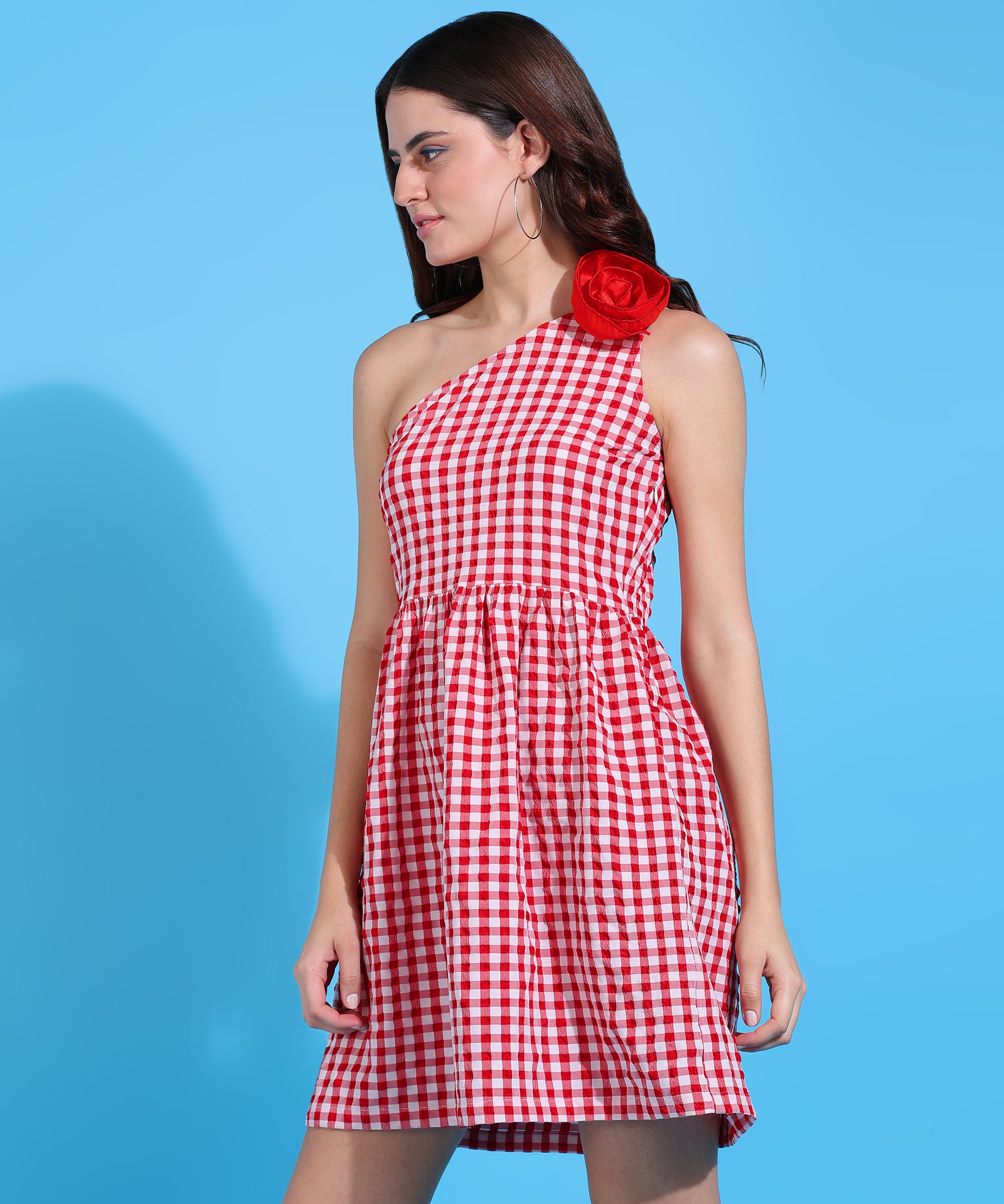 Stylish women’s one shoulder mini dress in red and white check pattern with a chic floral detail on the strap. Perfect for summer parties, picnics, and casual wear.