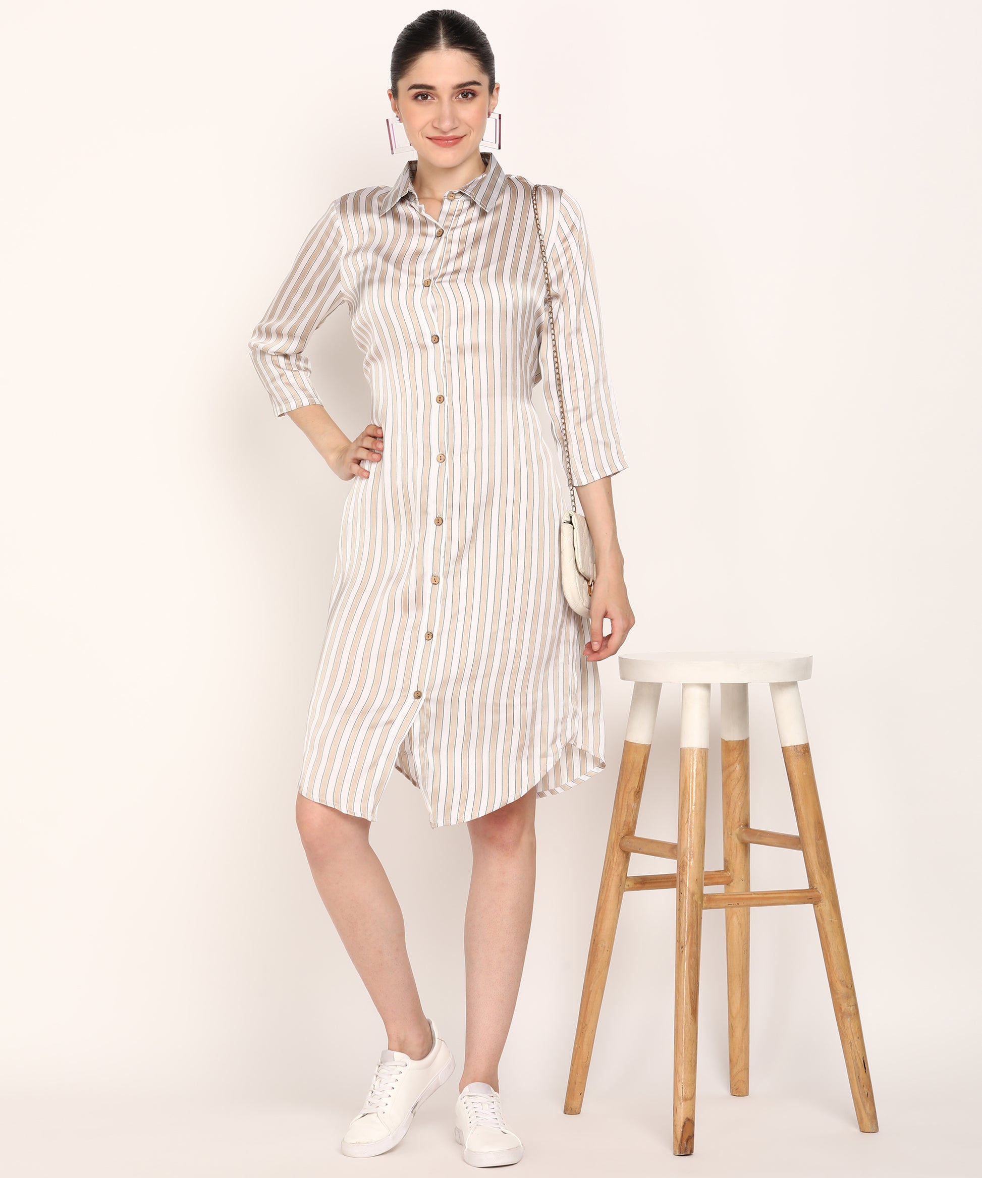 Step out in style with this chic beige and white striped shirt dress designed for effortless sophistication. Featuring a classic shirt collar, button-down front, and 3/4 sleeves, this dress is perfect for both casual outings and workdays. The vertical stripes elongate your silhouette while the relaxed fit ensures all-day comfort. Pair with sneakers for a laid-back look or dress it up with heels for a polished vibe.