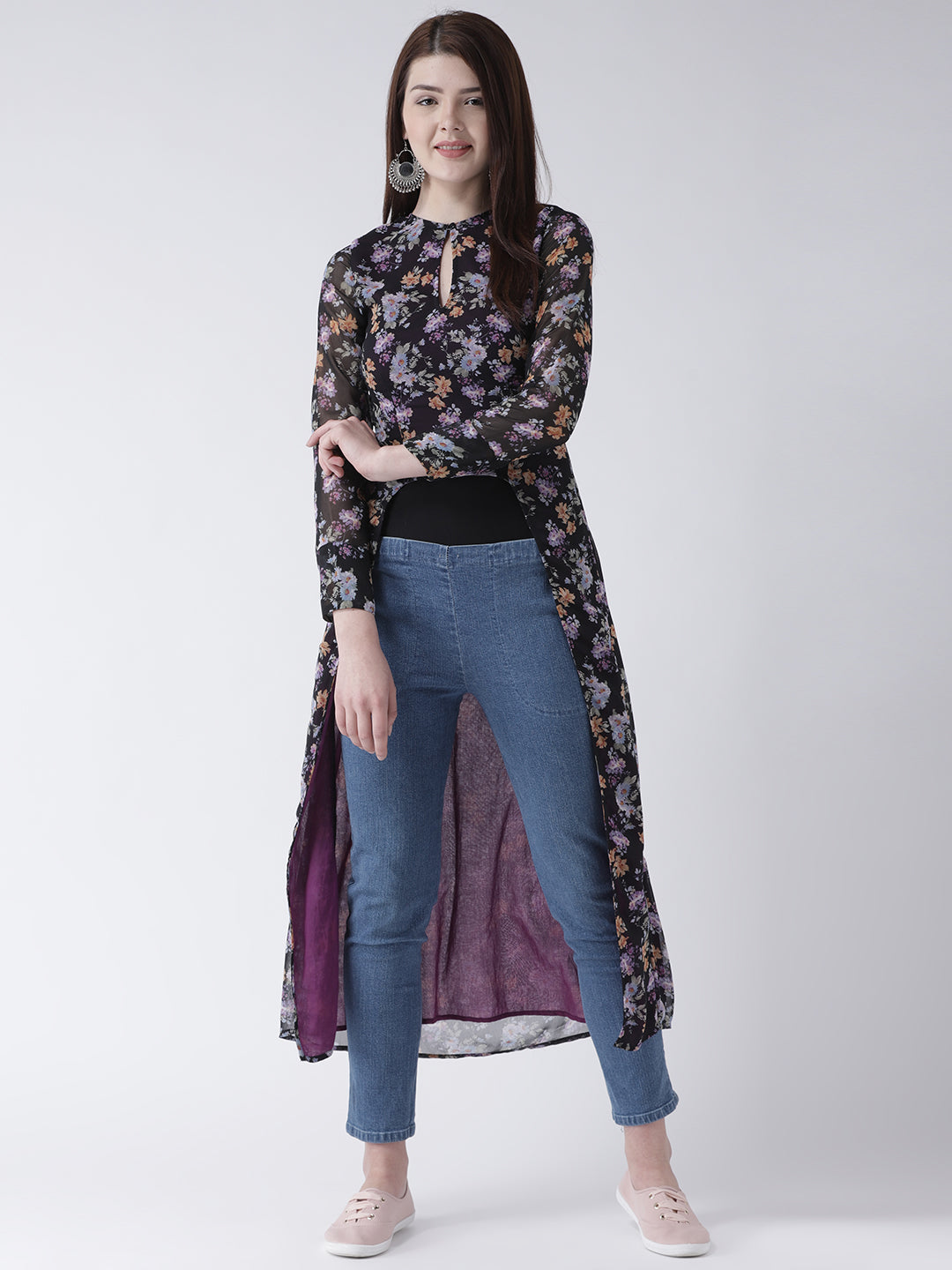 Elevate your ethnic wardrobe with this stylish black floral high-low kurta featuring sheer full sleeves and a keyhole neckline. Crafted for comfort and elegance, this kurta is perfect for casual outings, festive gatherings, or Indo-western looks. Pair it with jeans or leggings for a modern twist.