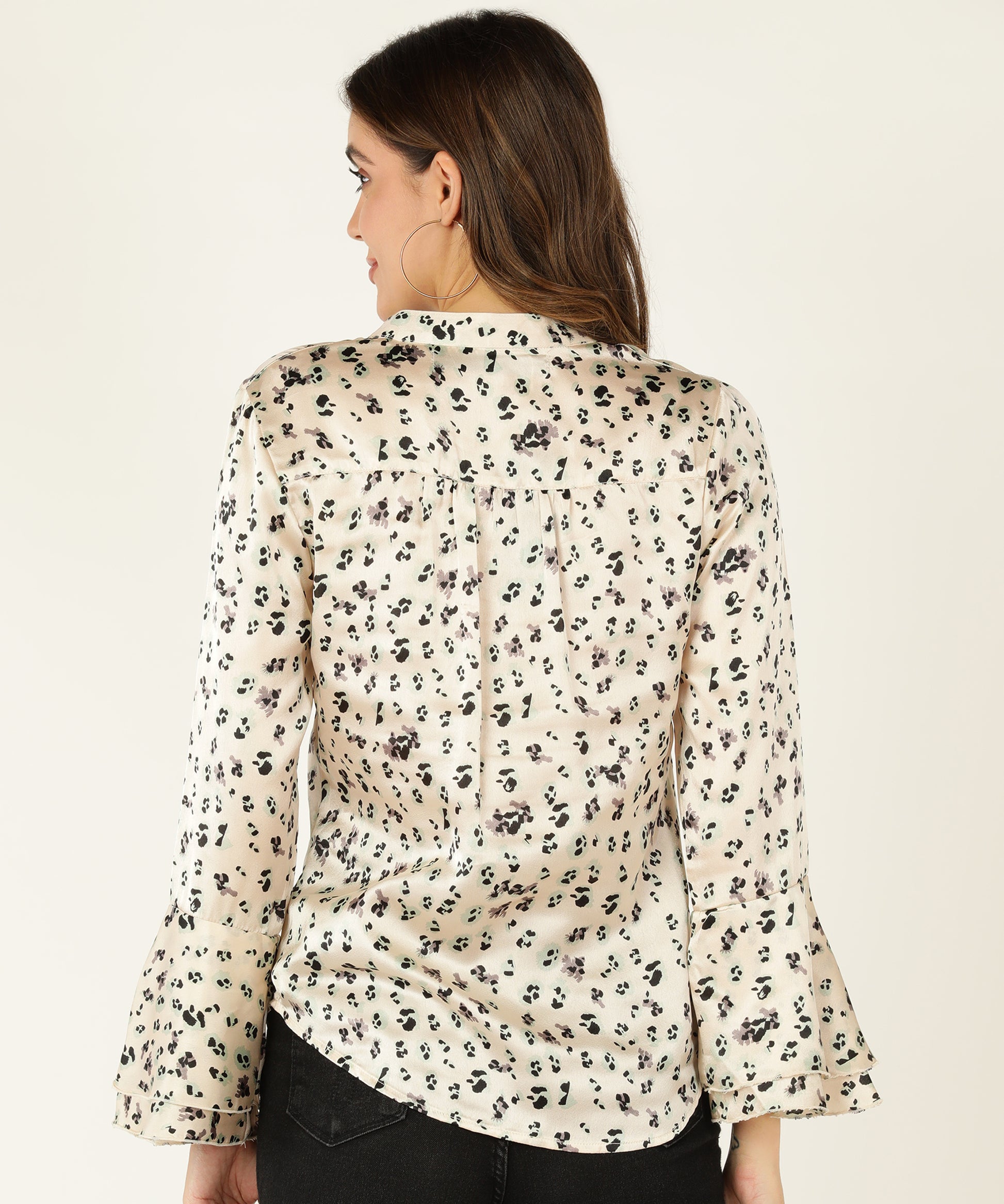 Women's Cream Satin Animal Print Shirt with Flared Sleeves