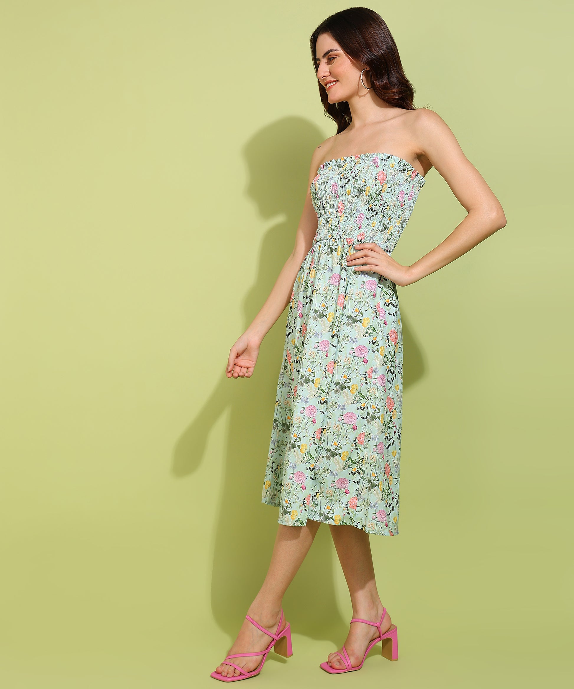 Women's Light Green Floral Strapless Smocked Midi Dress – Summer Beach Outfit