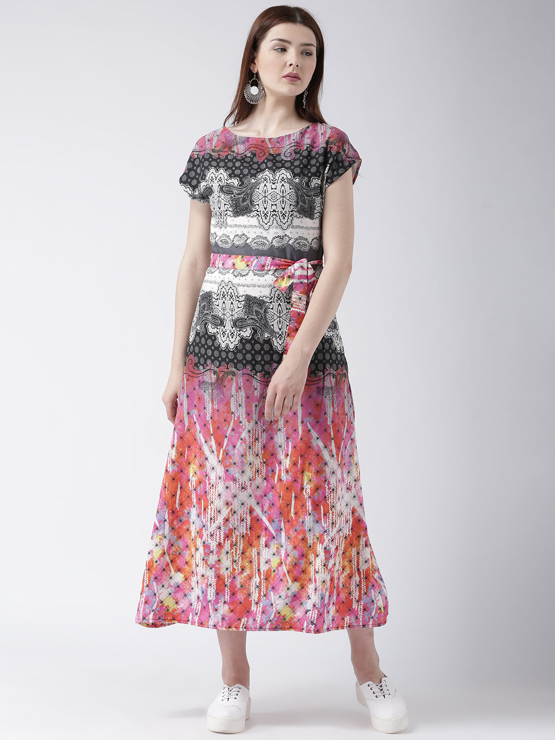 Women's Multicolor Printed A-Line Midi Dress with Belt
