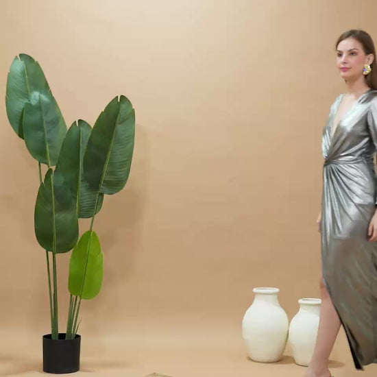 Elegant silver metallic maxi dress featuring a deep plunge neckline, long fitted sleeves, and a dramatic high front slit. Crafted from shimmering fabric for a glamorous look, perfect for evening parties, cocktails, and special occasions. Designed for a flattering silhouette and bold style statement.
